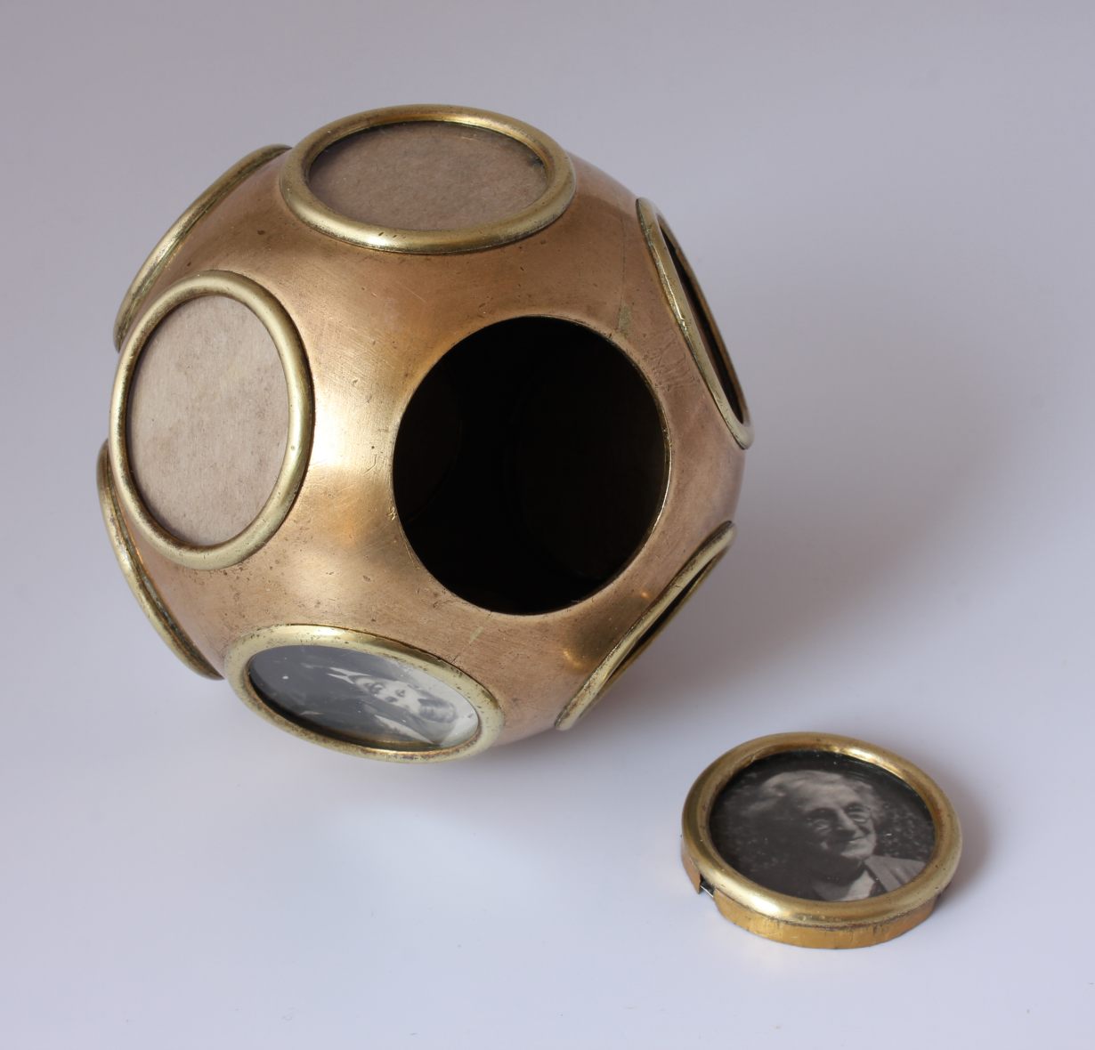 This unusual Victorian globular photograph frame which is made of brass has 12 glazed apertures for individual photographs and is a rare collectable piece.