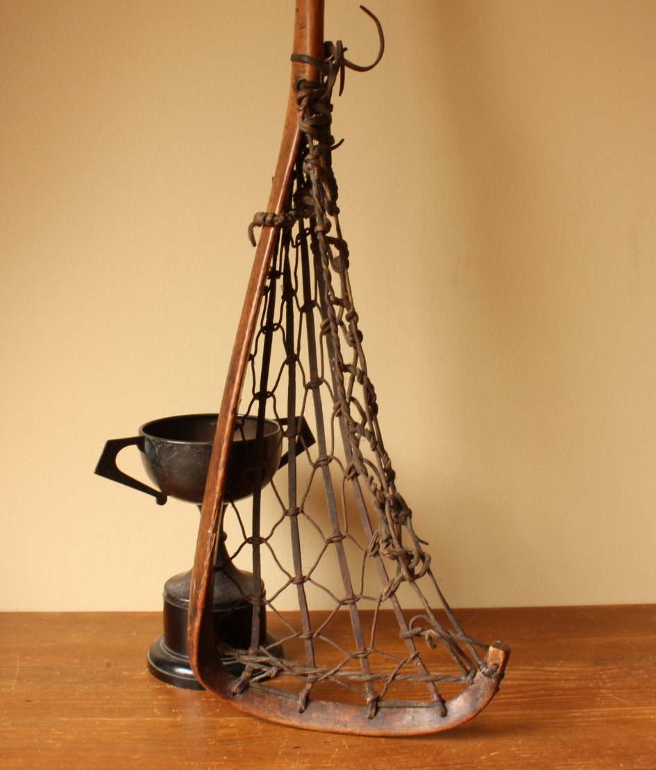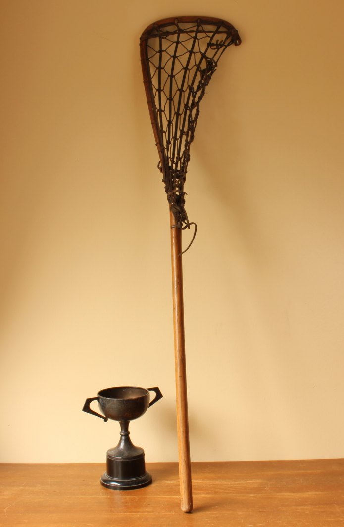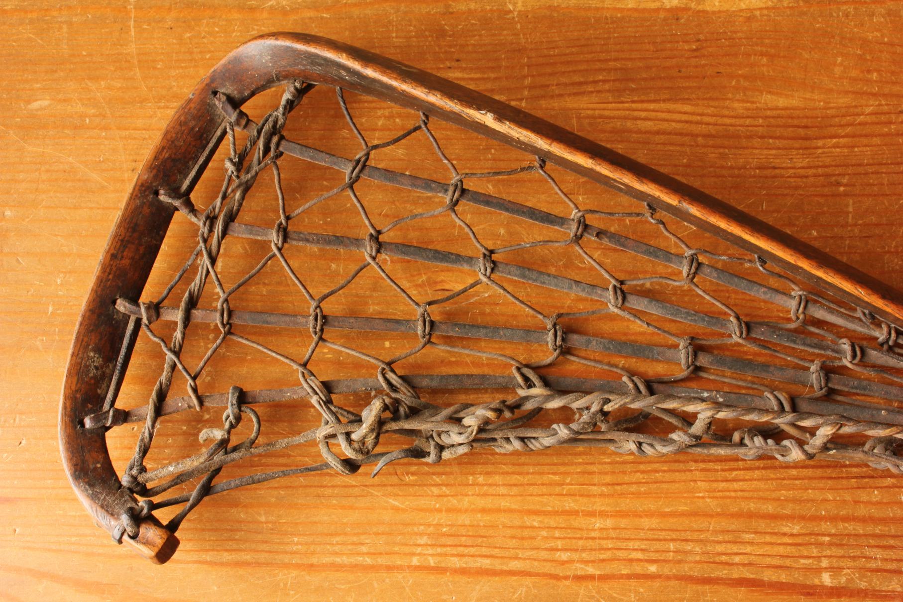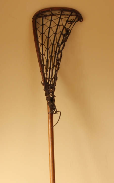 This handsome vintage Lacrosse stick which is marked Viktoria measures 102 cm - 40 1/4 inches in length, has a hickory handle, leather and gut cord net and has a very nice age related patina.