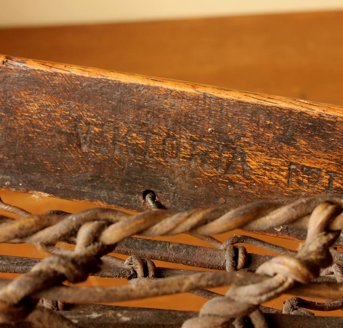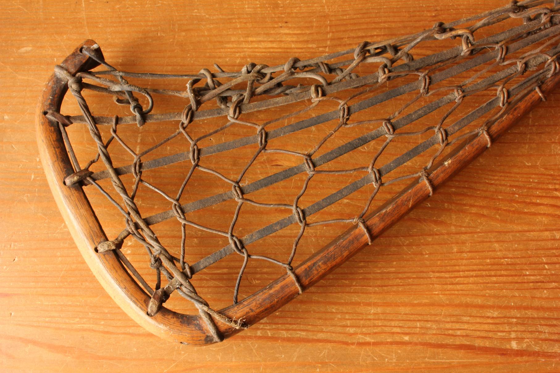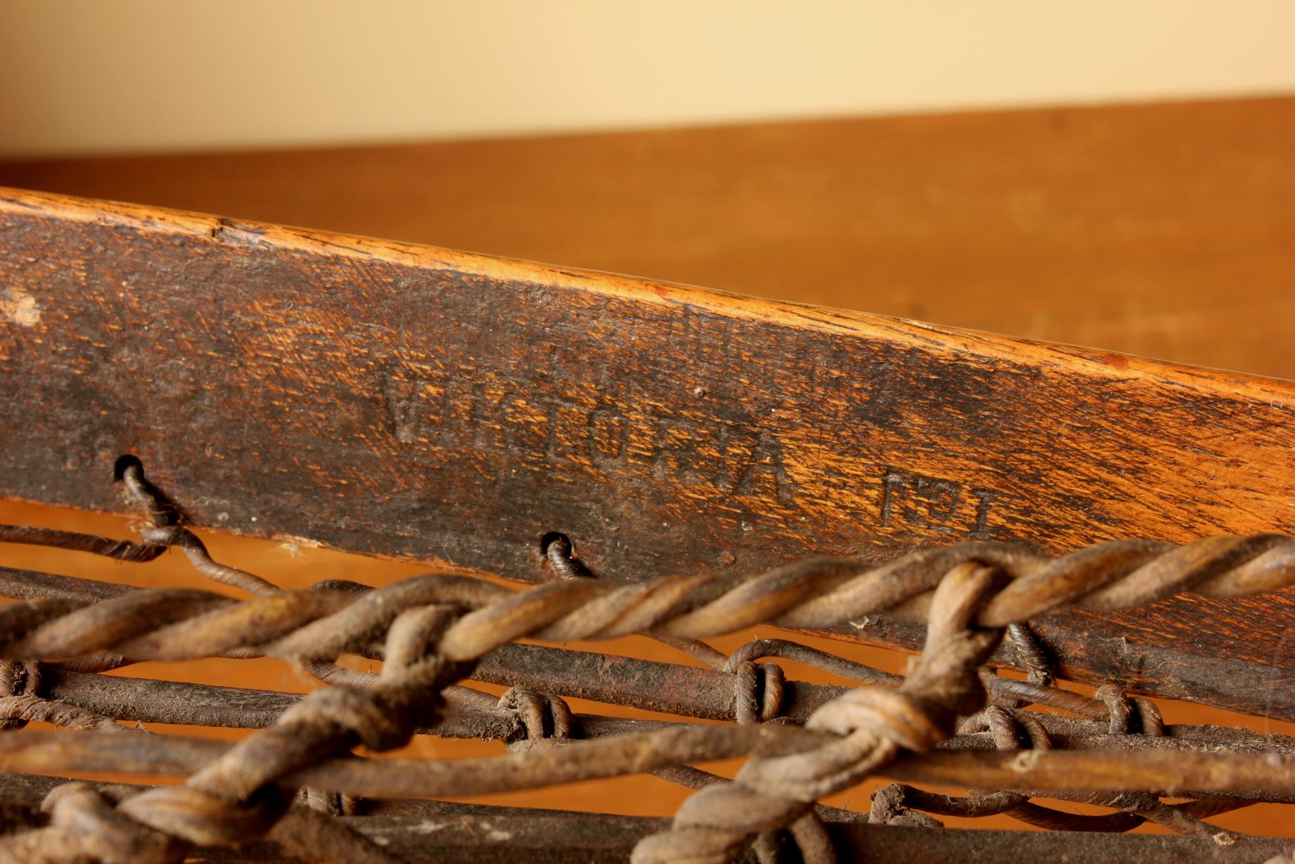 This handsome vintage Lacrosse stick which is marked Viktoria measures 102 cm - 40 1/4 inches in length, has a hickory handle, leather and gut cord net and has a very nice age related patina.