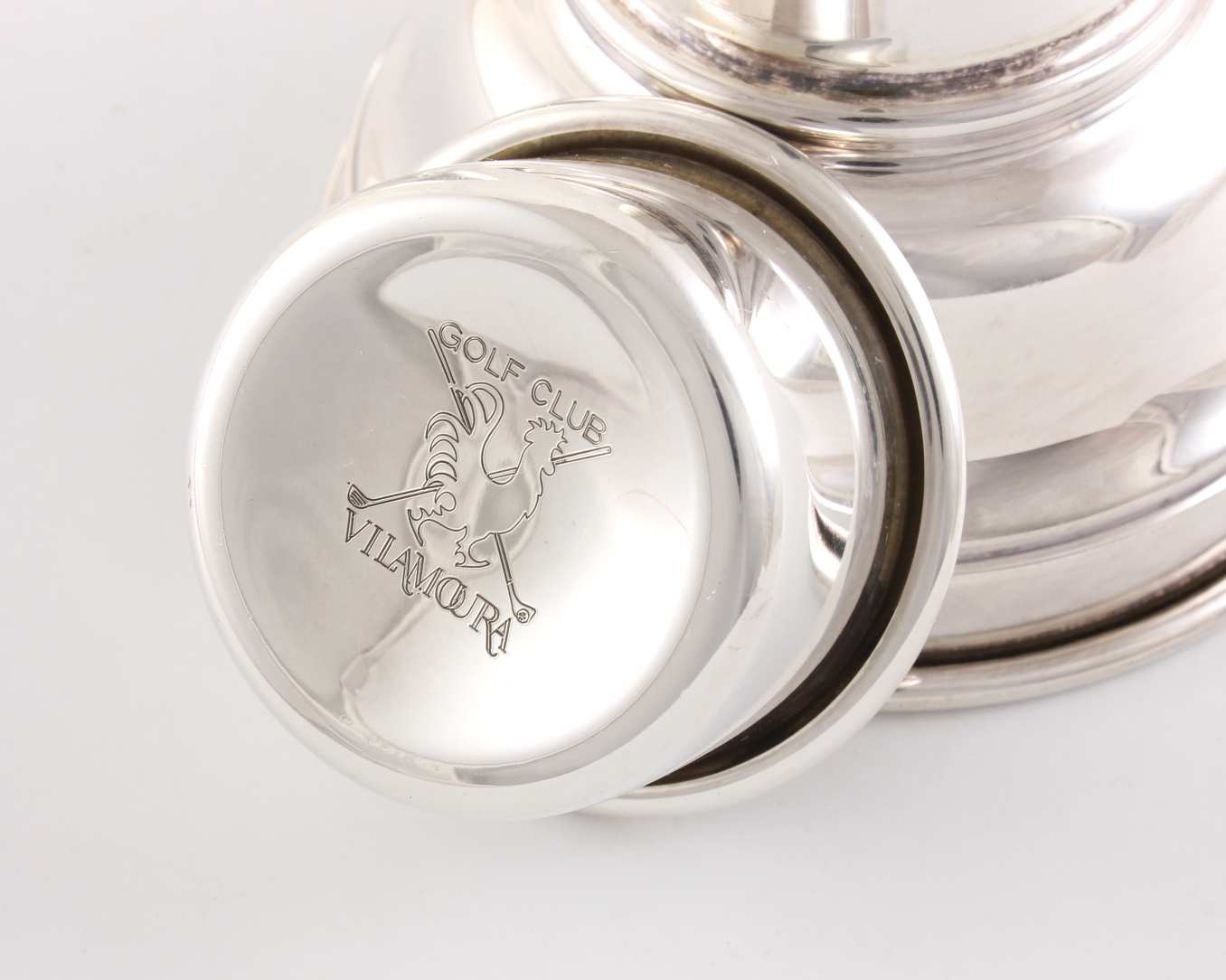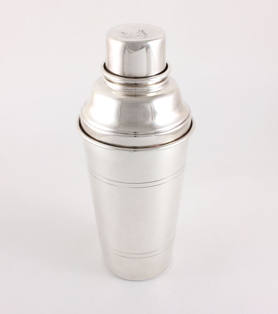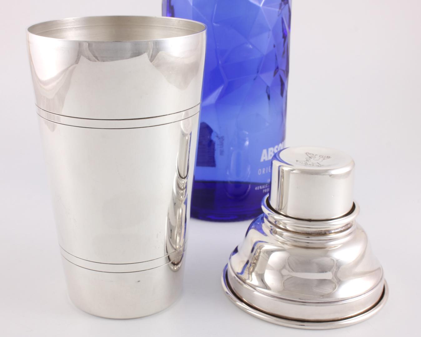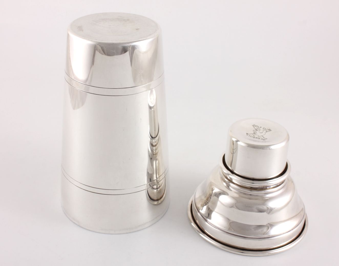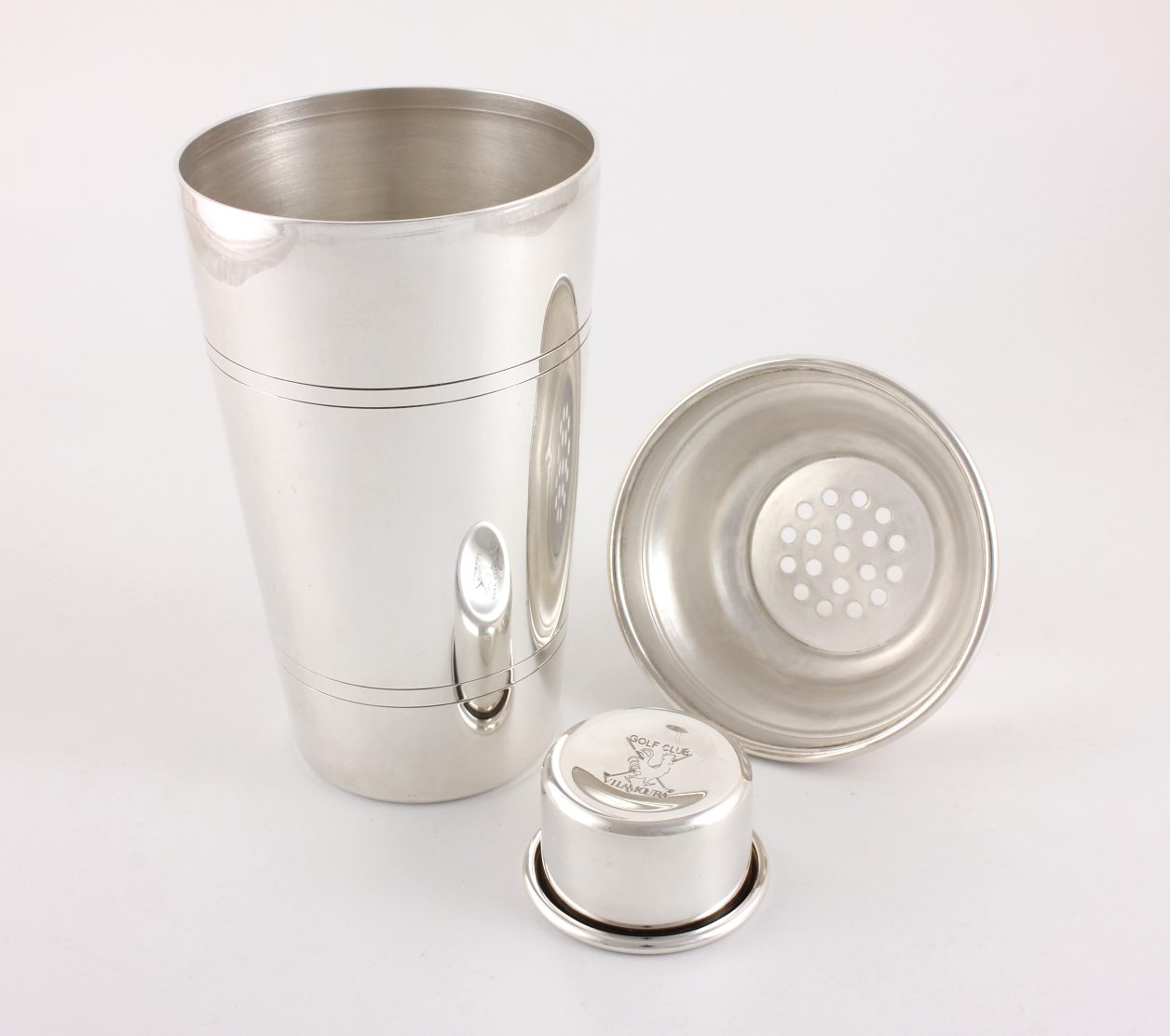This stylish 3 piece cocktail shaker which is made of silver plate dates from the mid 20th century and is nicely marked to the top with Vilamoura Golf Club and logo of a cockerel with crossed golf clubs.