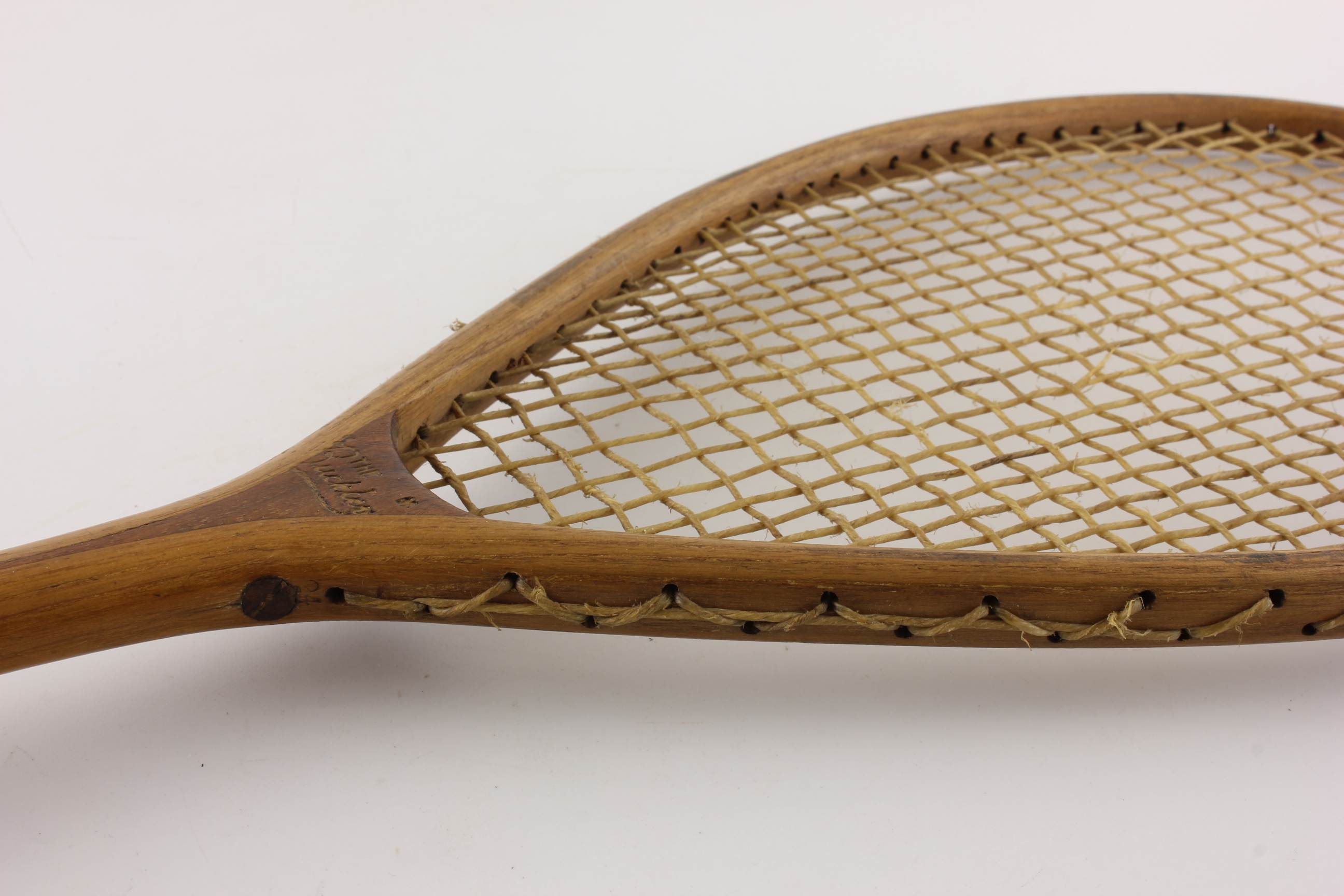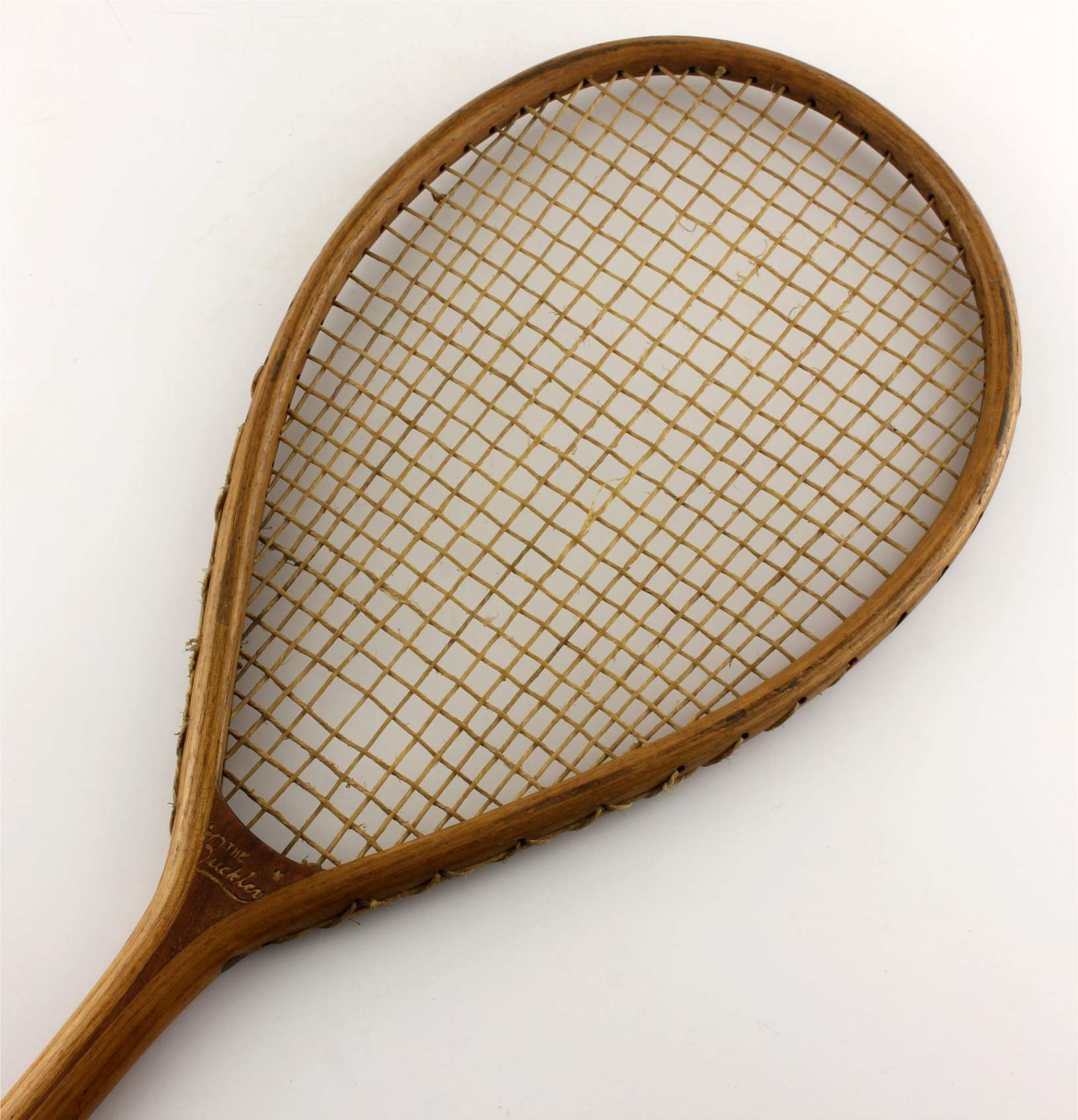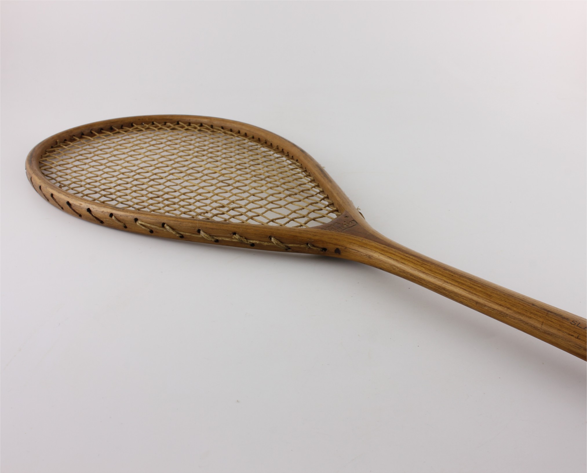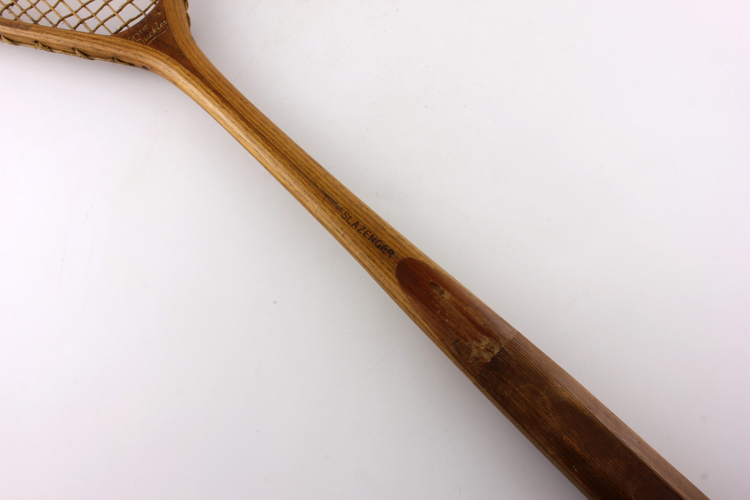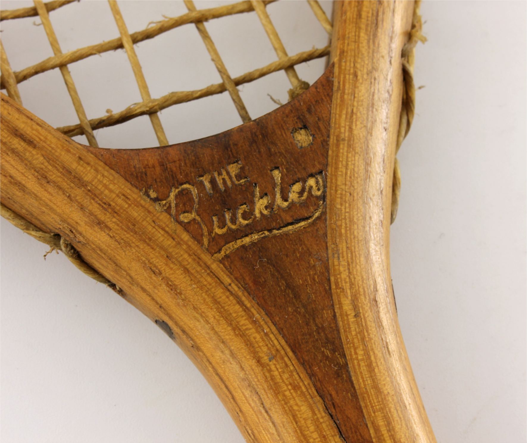 This scarce antique badminton racket which is made of wood has a teardrop shape head with gut stringing, octagonal handle which is embossed with Slazenger and is stamped with The Buckley to the throat.