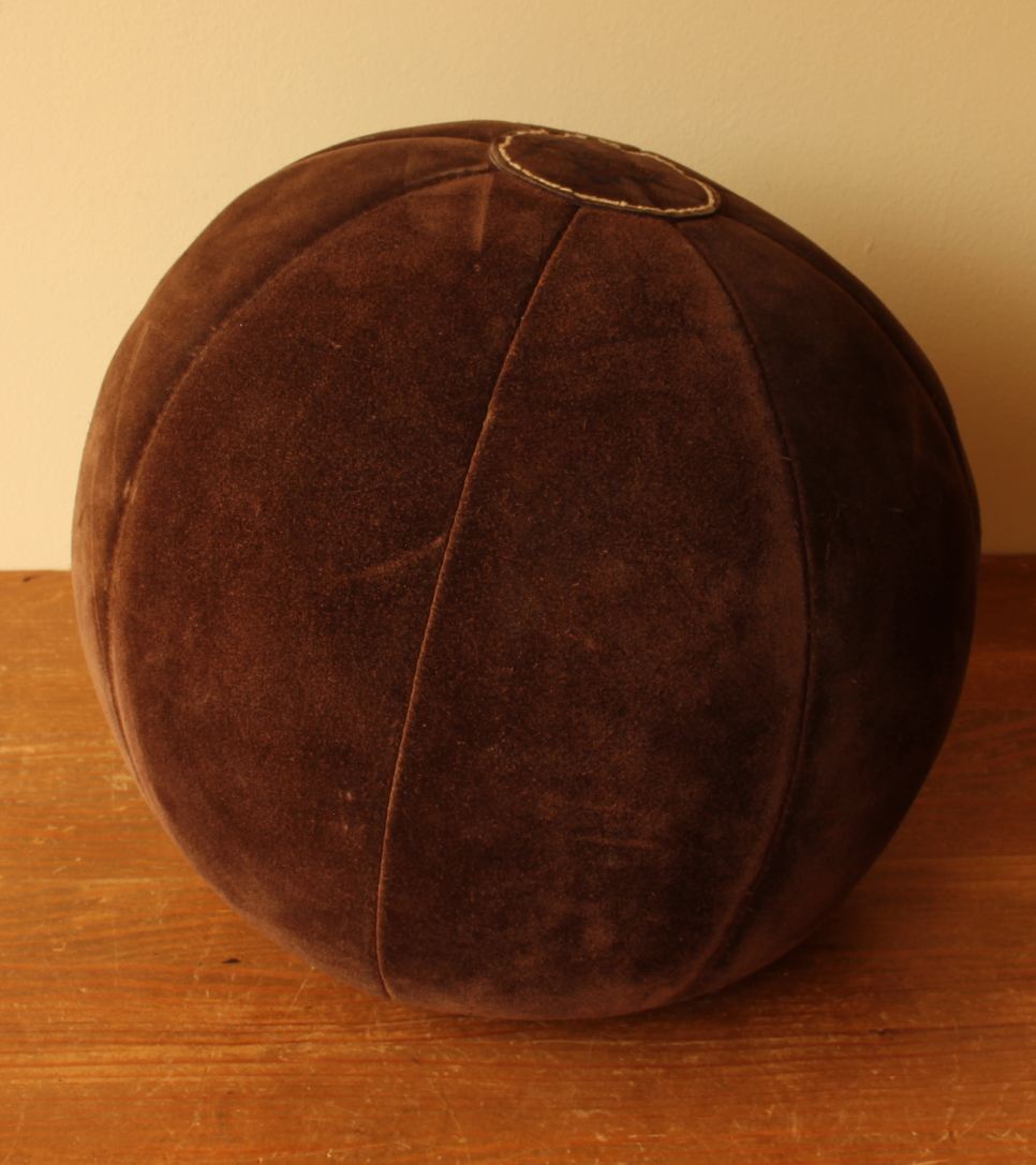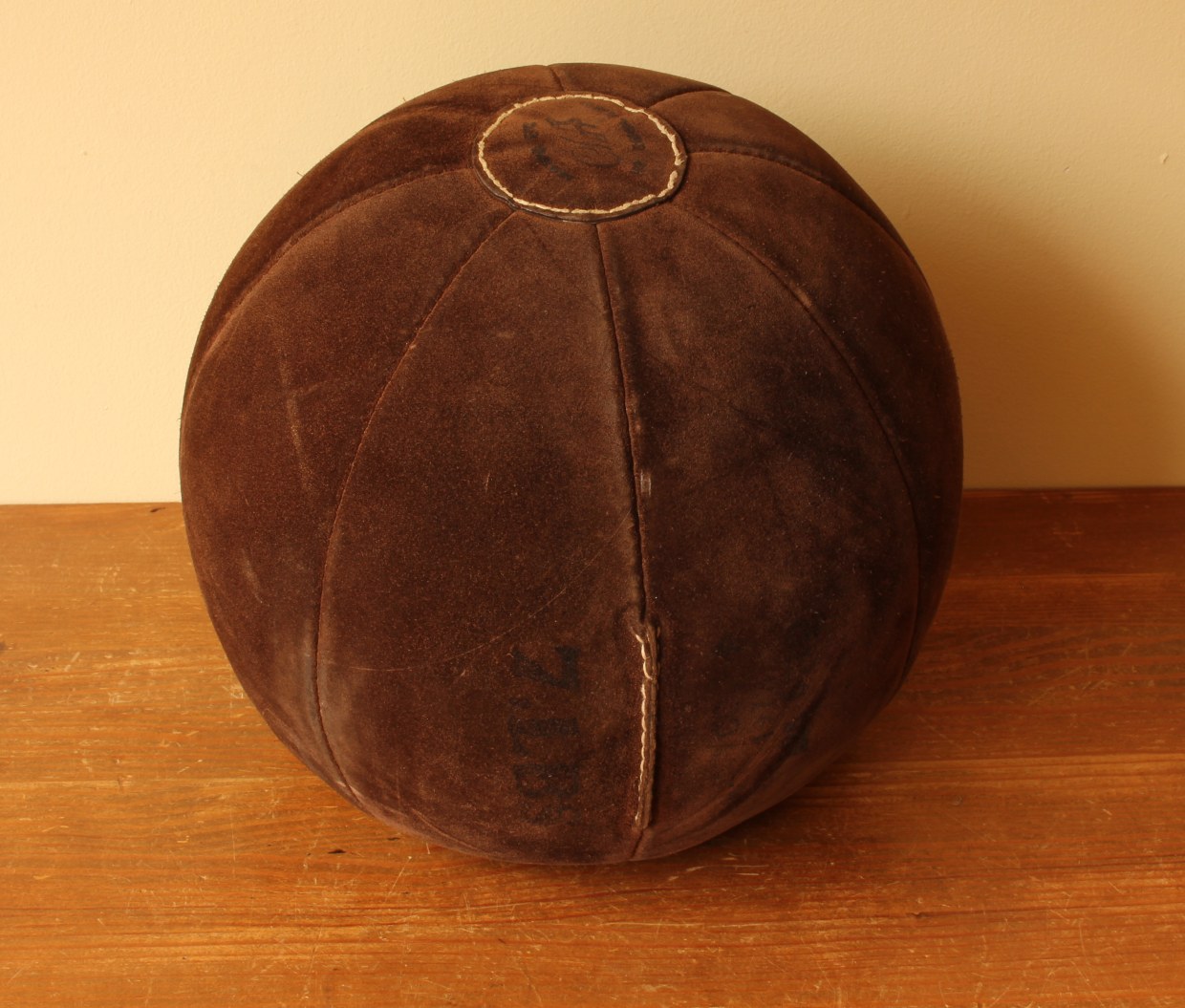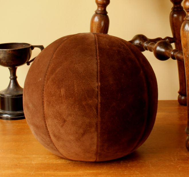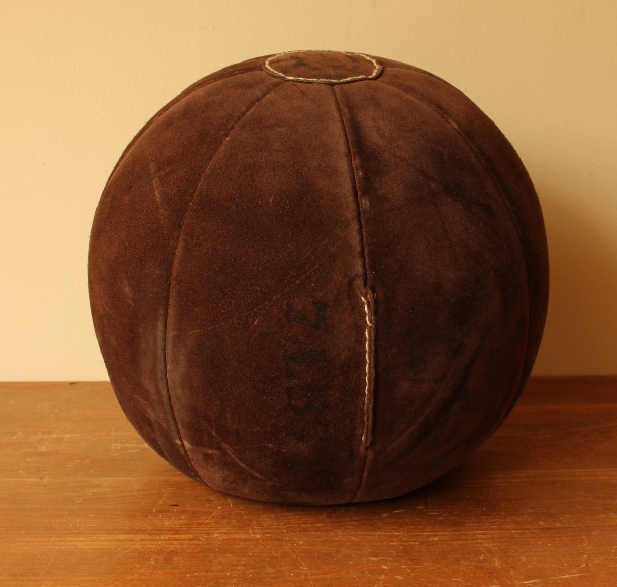 This vintage medicine ball which is made of brown suede leather is a very nice decorative item for a gym, shop, prop or an unusual footstool.