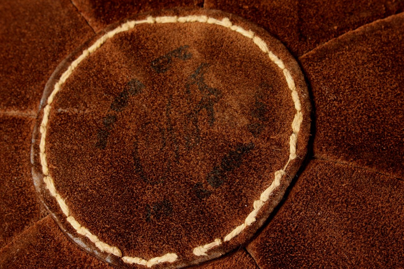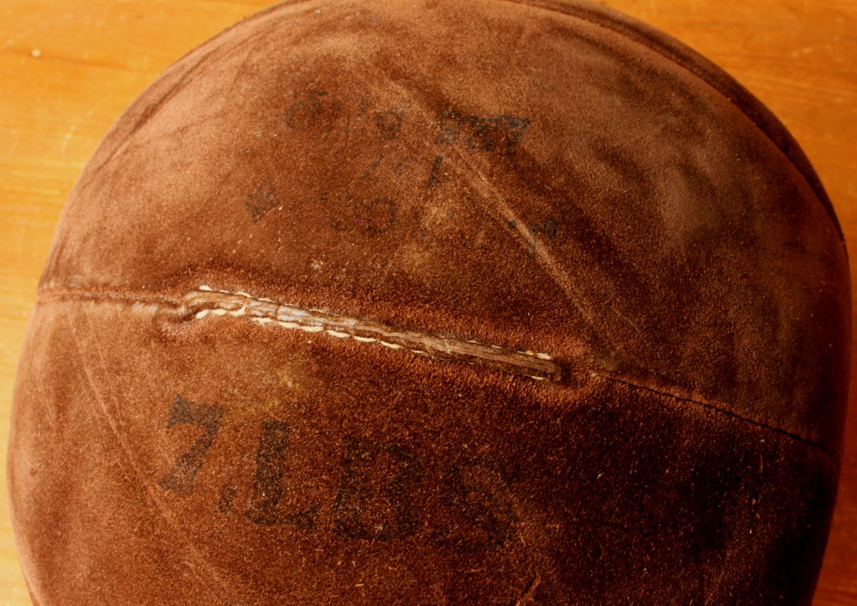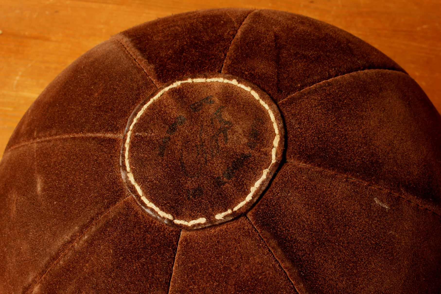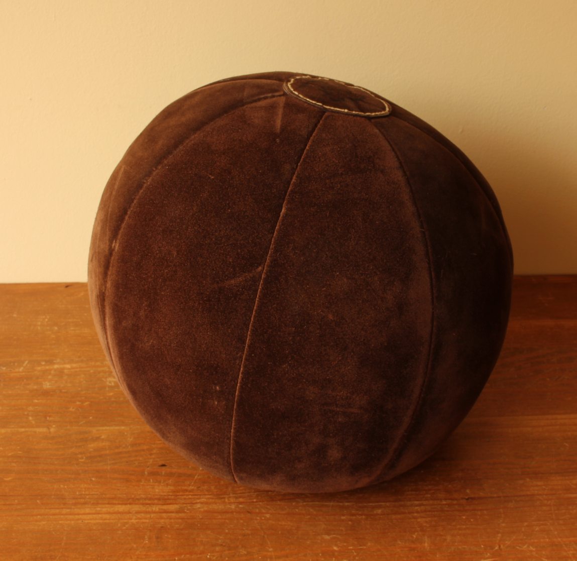 This vintage medicine ball which is made of brown suede leather is a very nice decorative item for a gym, shop, prop or an unusual footstool.