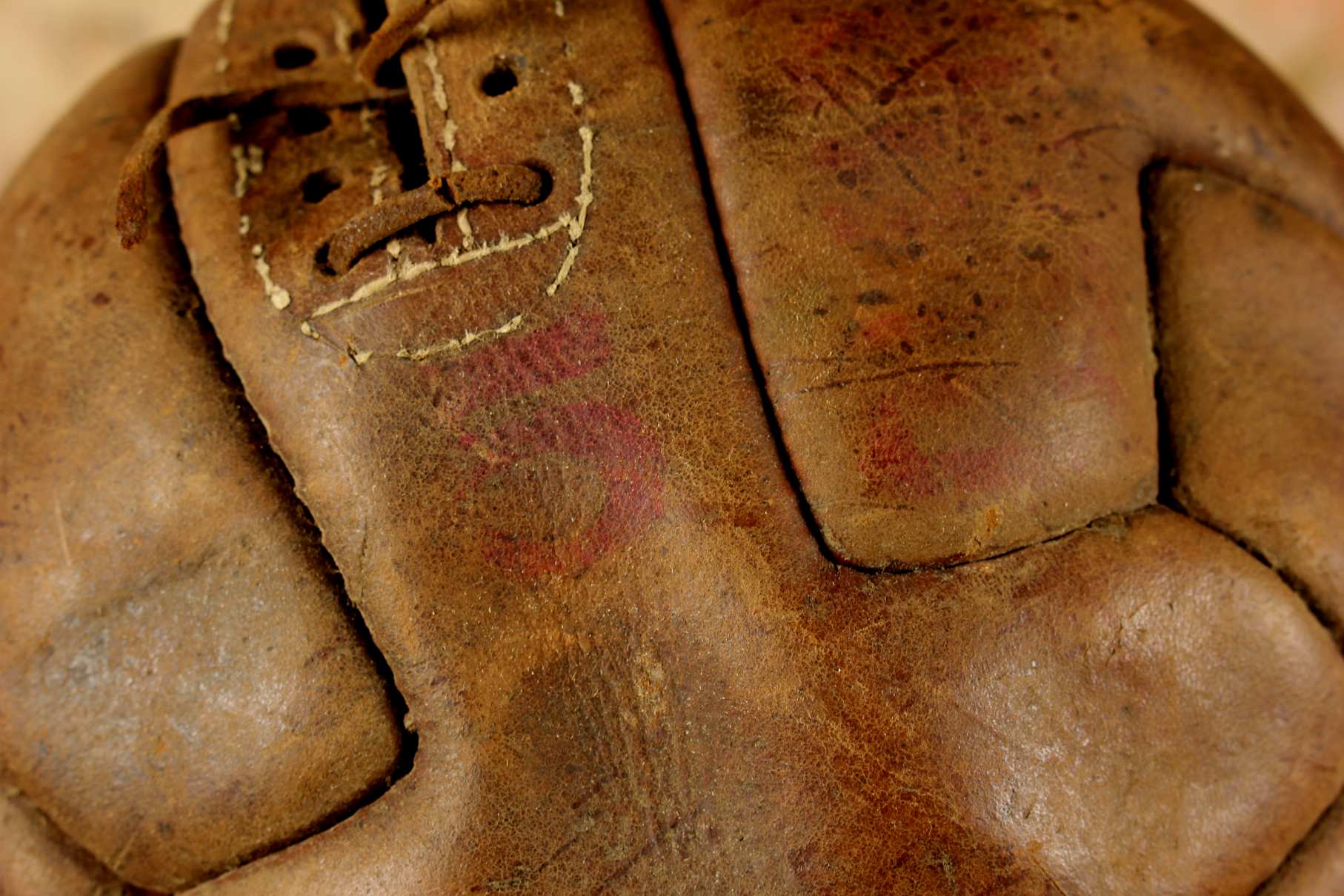 This great looking soccer ball is marked with "Club Super" and the number 5 in red print and has 11 panels in the T design. This ball does not have a bladder fitted but the leather has hardened so holds it's shape.