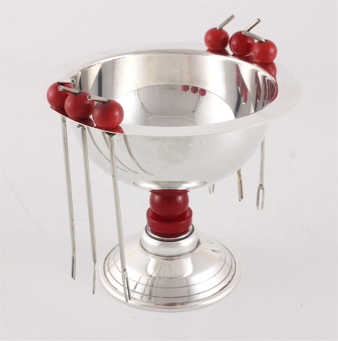This novelty vintage cocktail accessory which comprises of a silver plated bowl with six cherry final cocktail sticks dates from the first half of the 20th century and is by PH Vogel & Co.