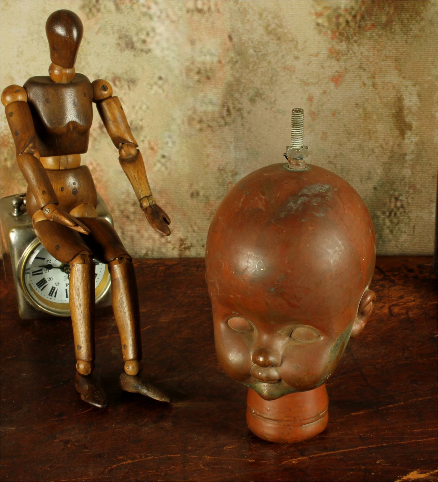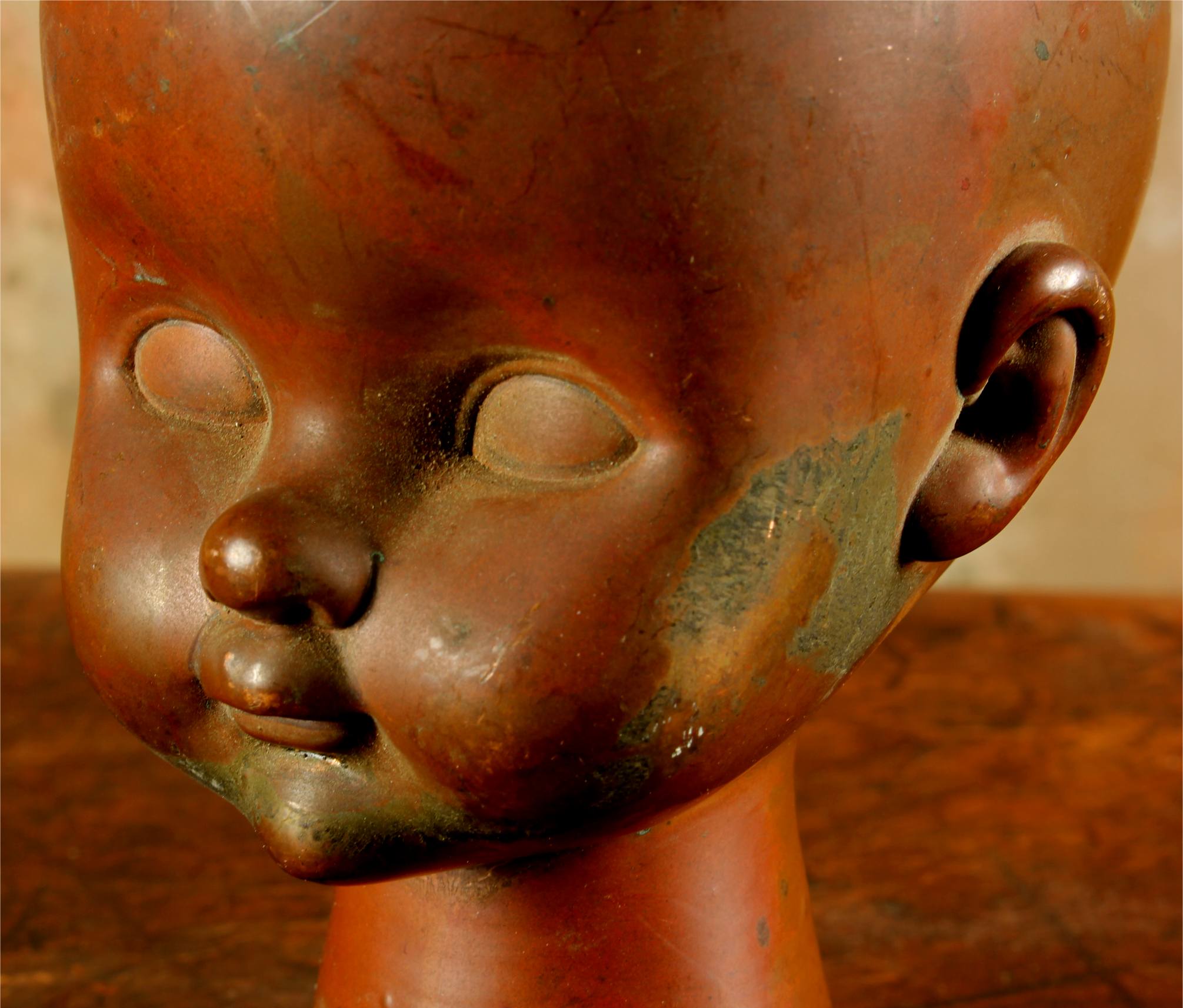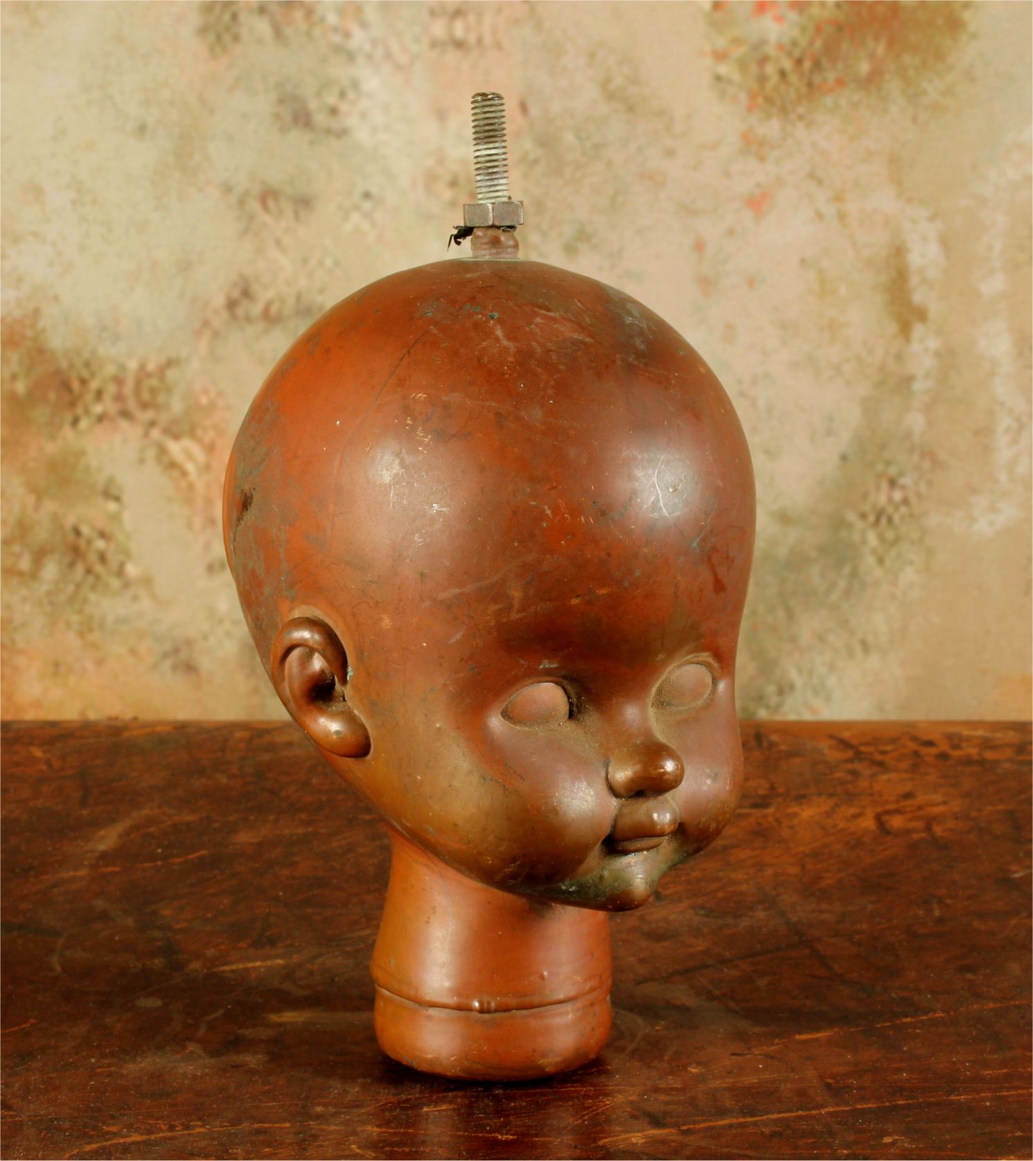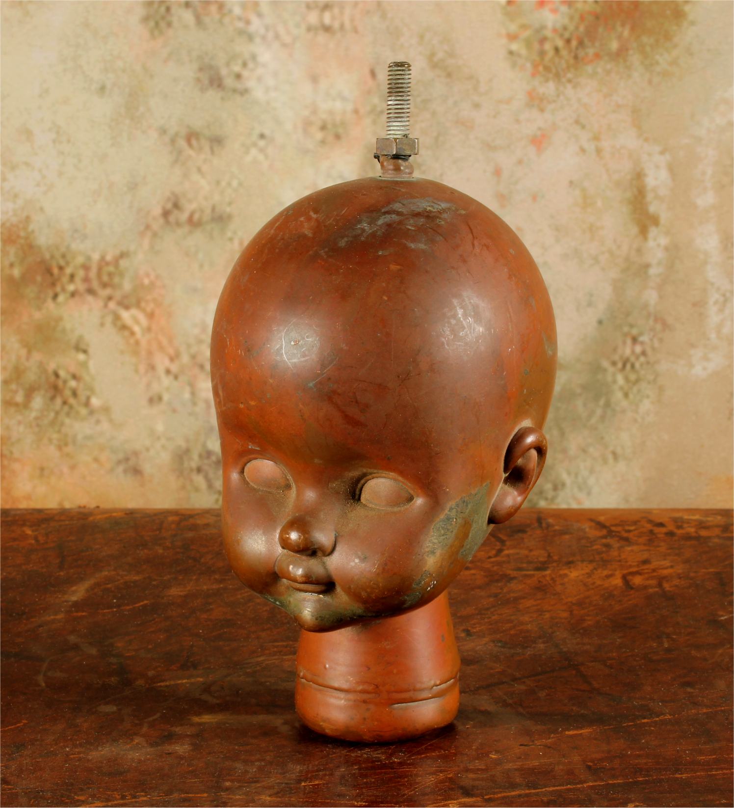 This unusual doll head mould which dates from the mid 20th century is made of heavy copper and came from Bella Doll factory in Perpignan, France.
