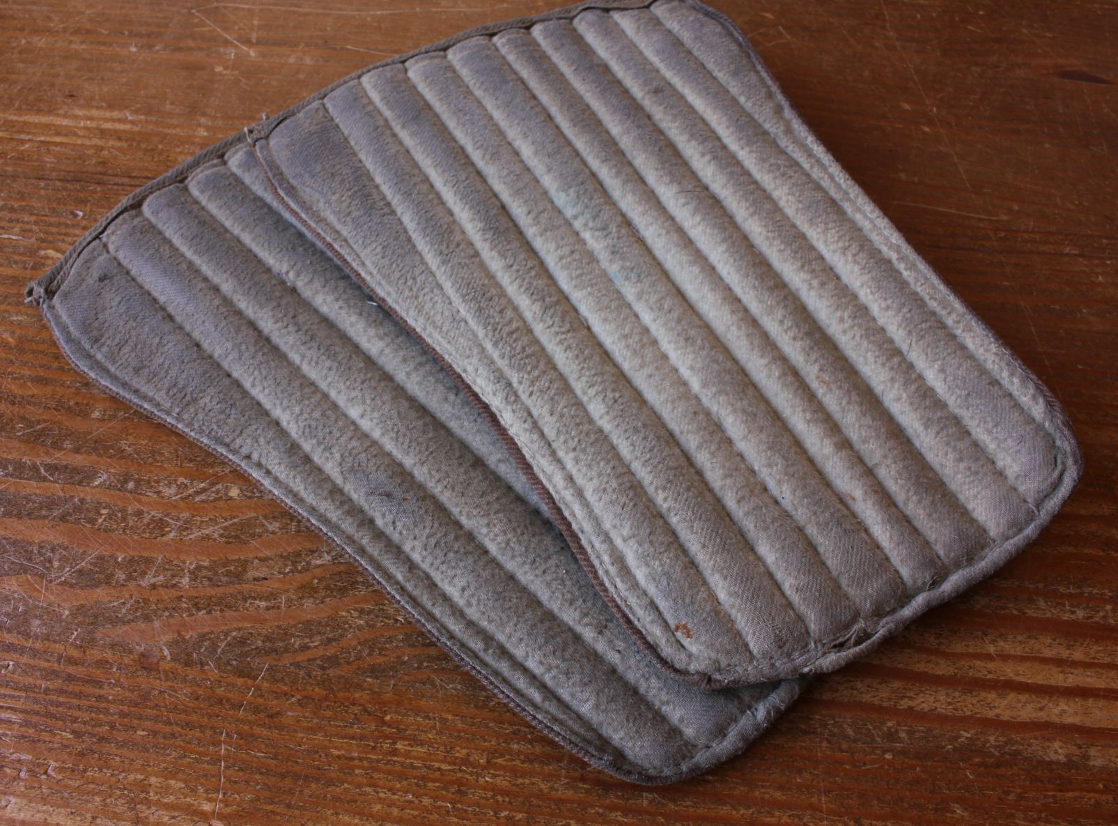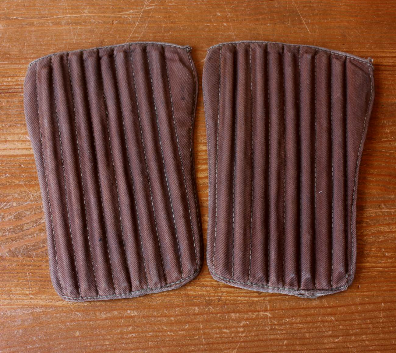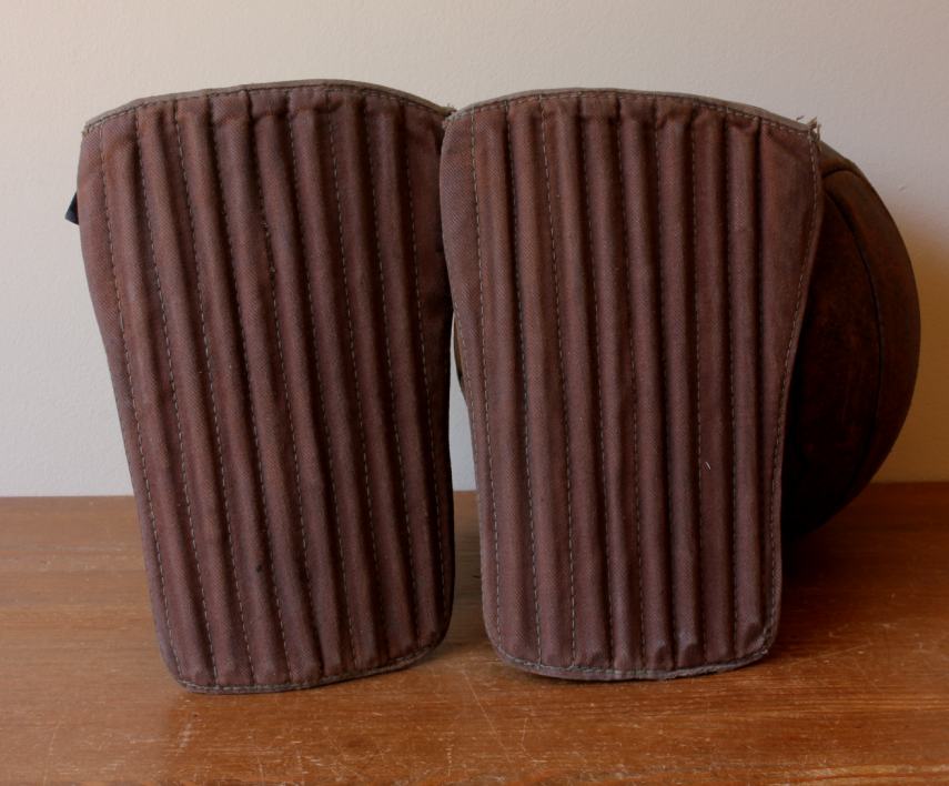 This pair of antique shinpads which date from the early 20th century are made of canvas, have tube stiffeners inside and are approx 23 cm (9") high.