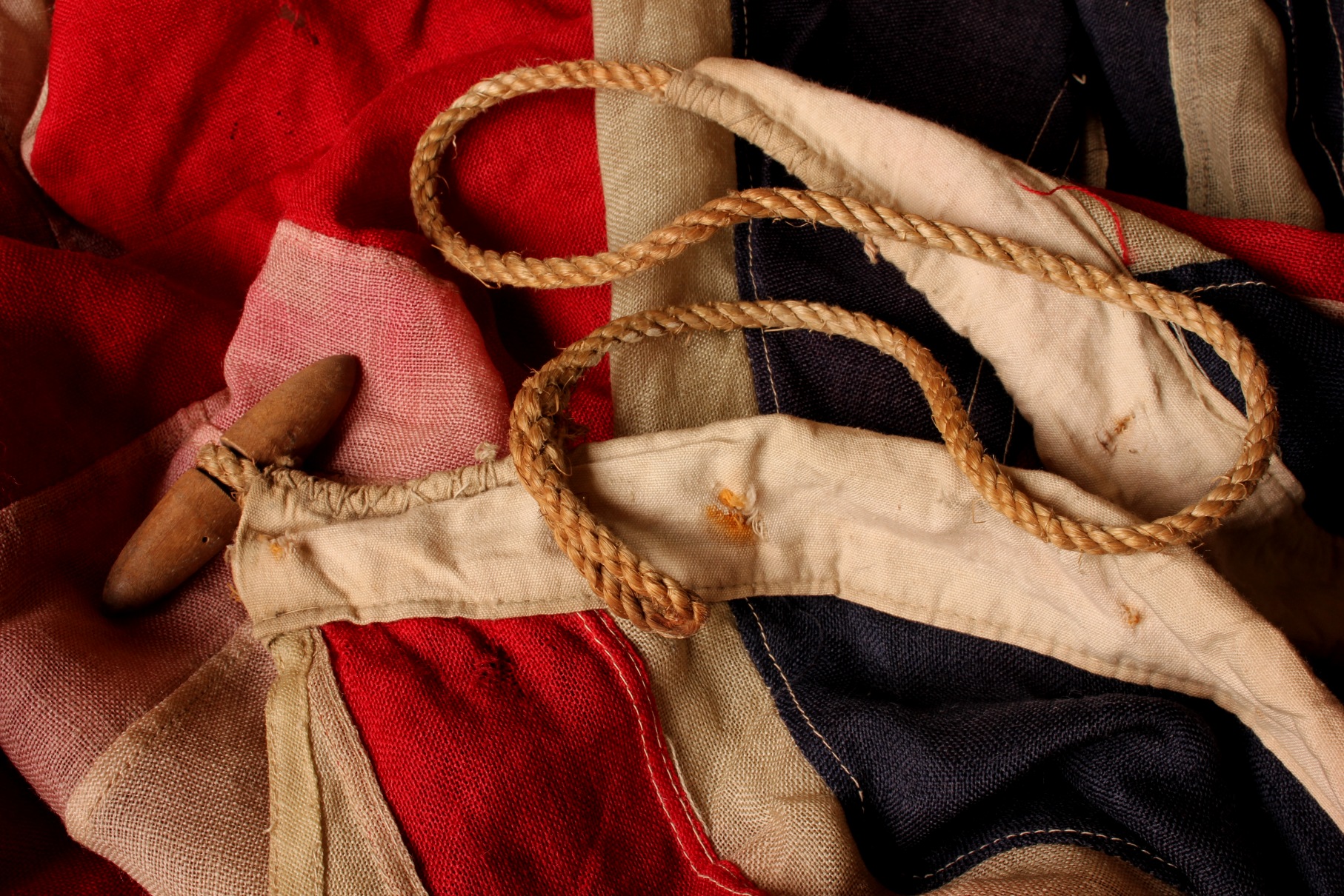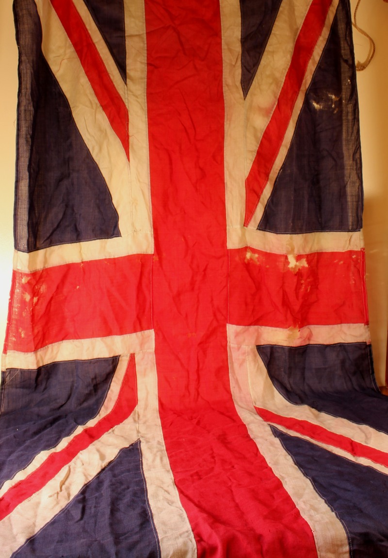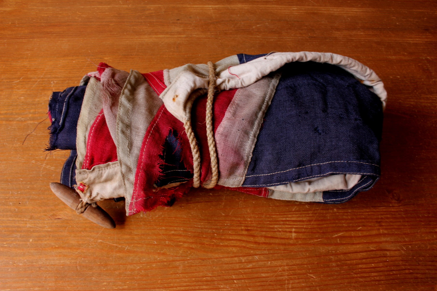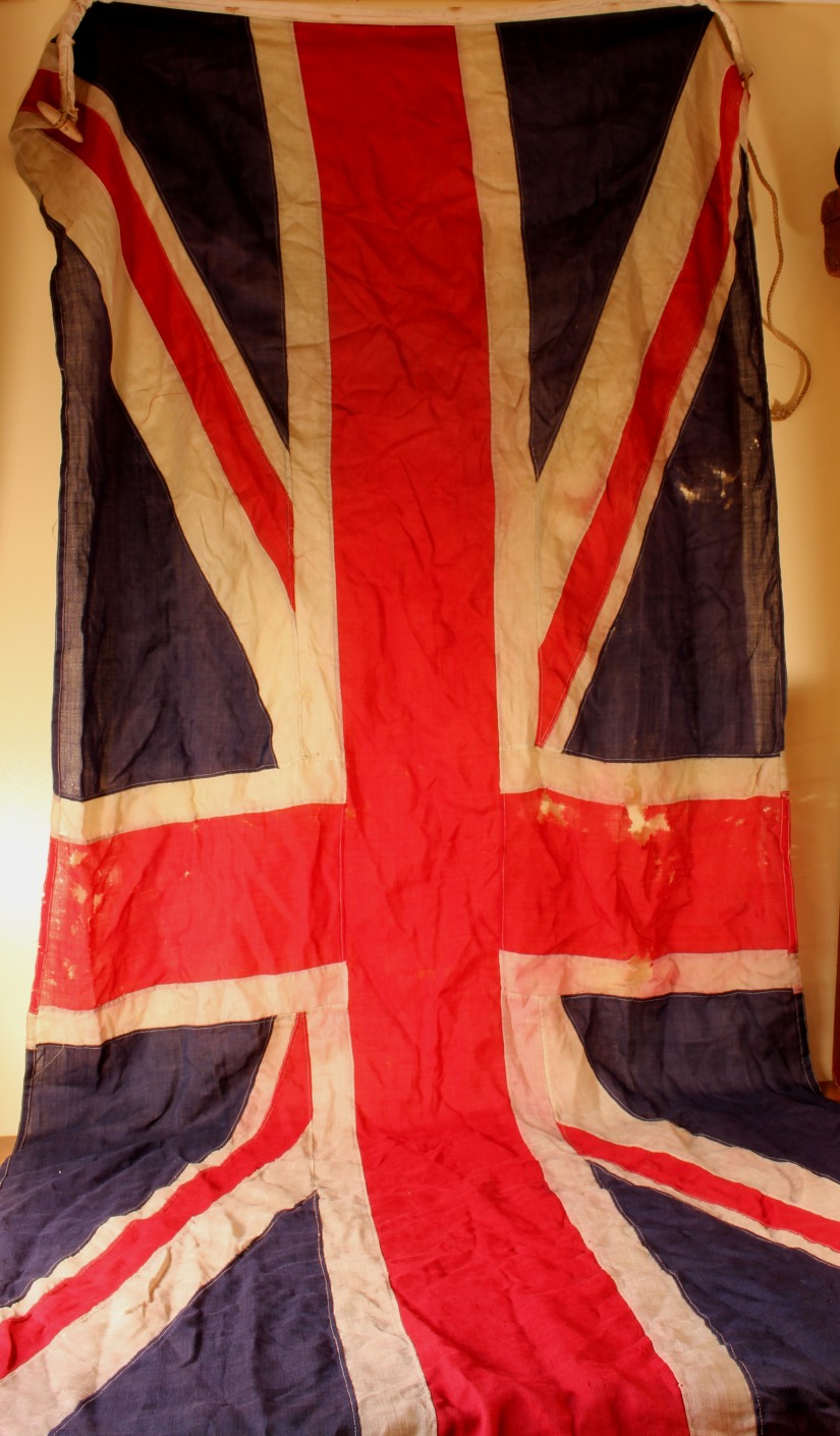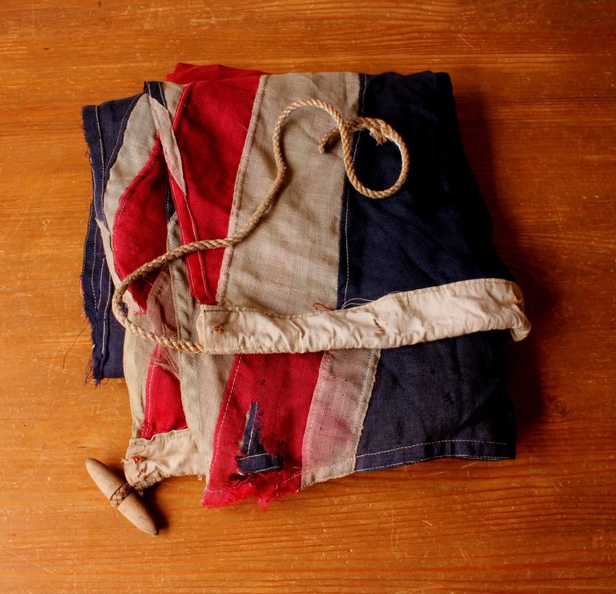 This large original vintage Union Jack Flag which dates from c1930 is a nice size at 8 feet in length, has halyard rope with a wooden toggle and each segment is individually sewn.