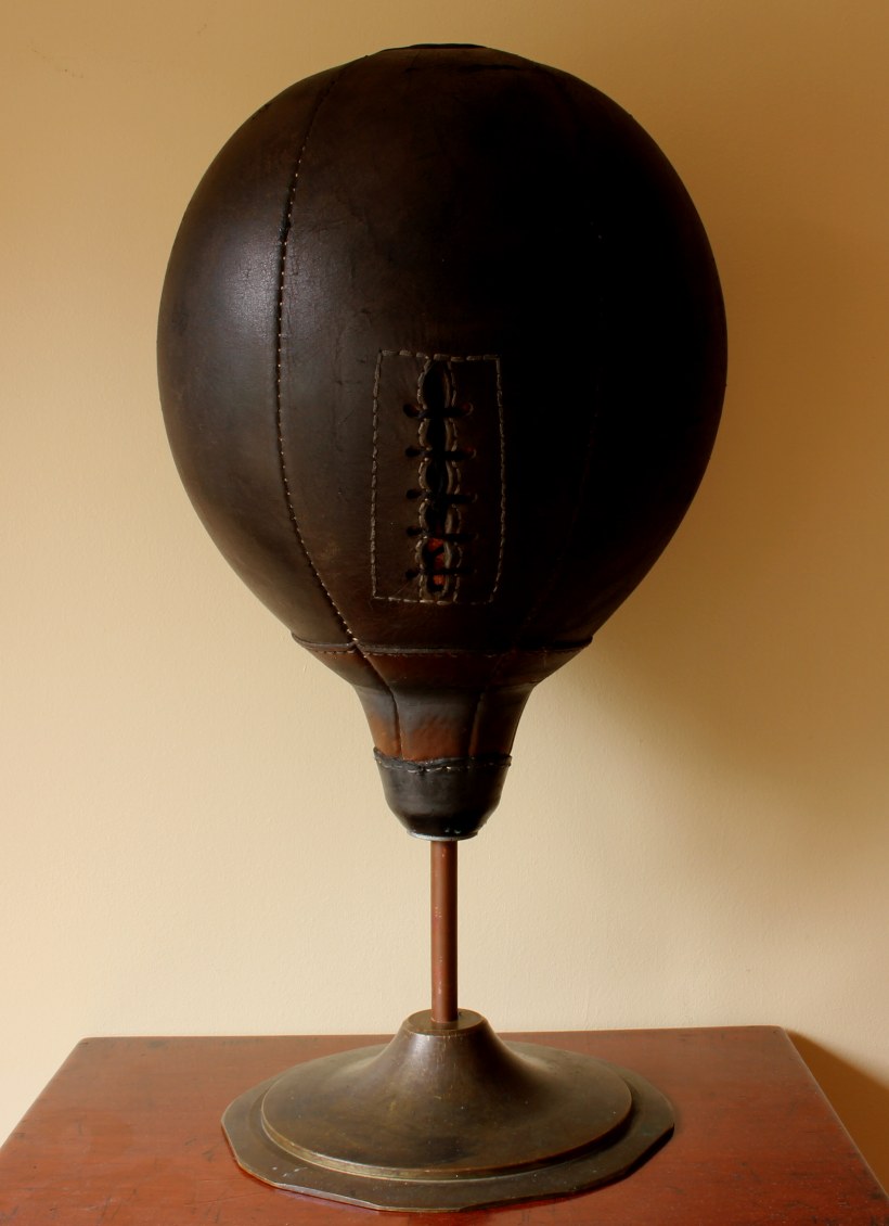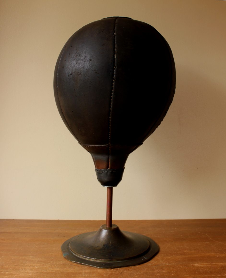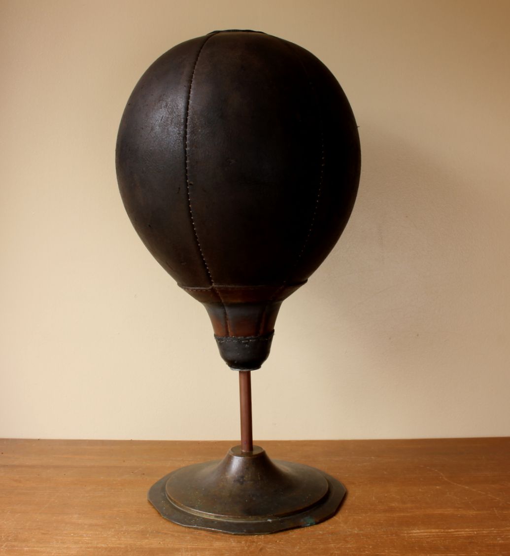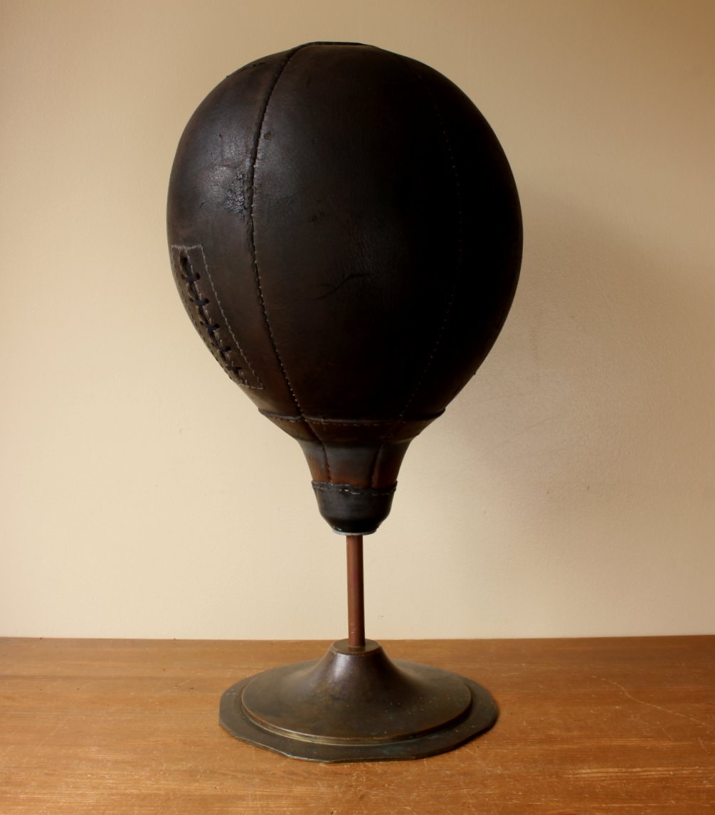 This vintage laced boxing ball which dates from the mid 20th century was originally used in a boxing punch ball arcade game in France but has now been mounted on a contemporary heavy brass base so makes a super decorative item for a mancave, gym, shop, bar or prop.