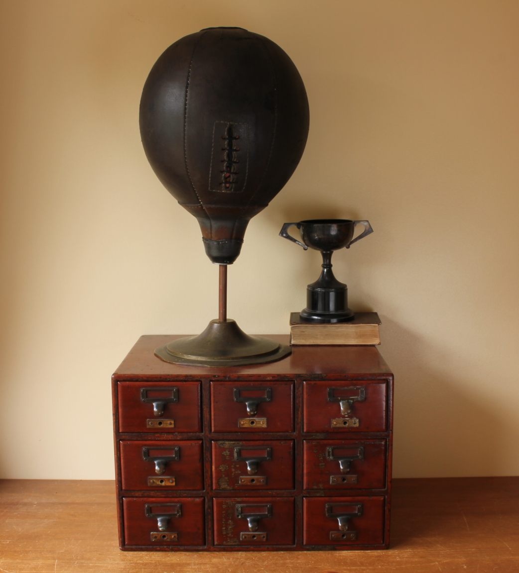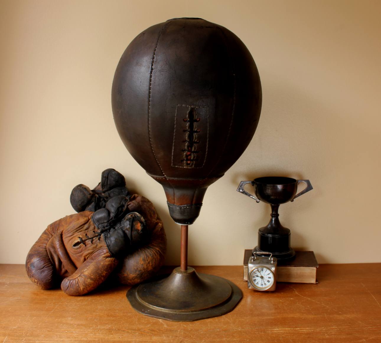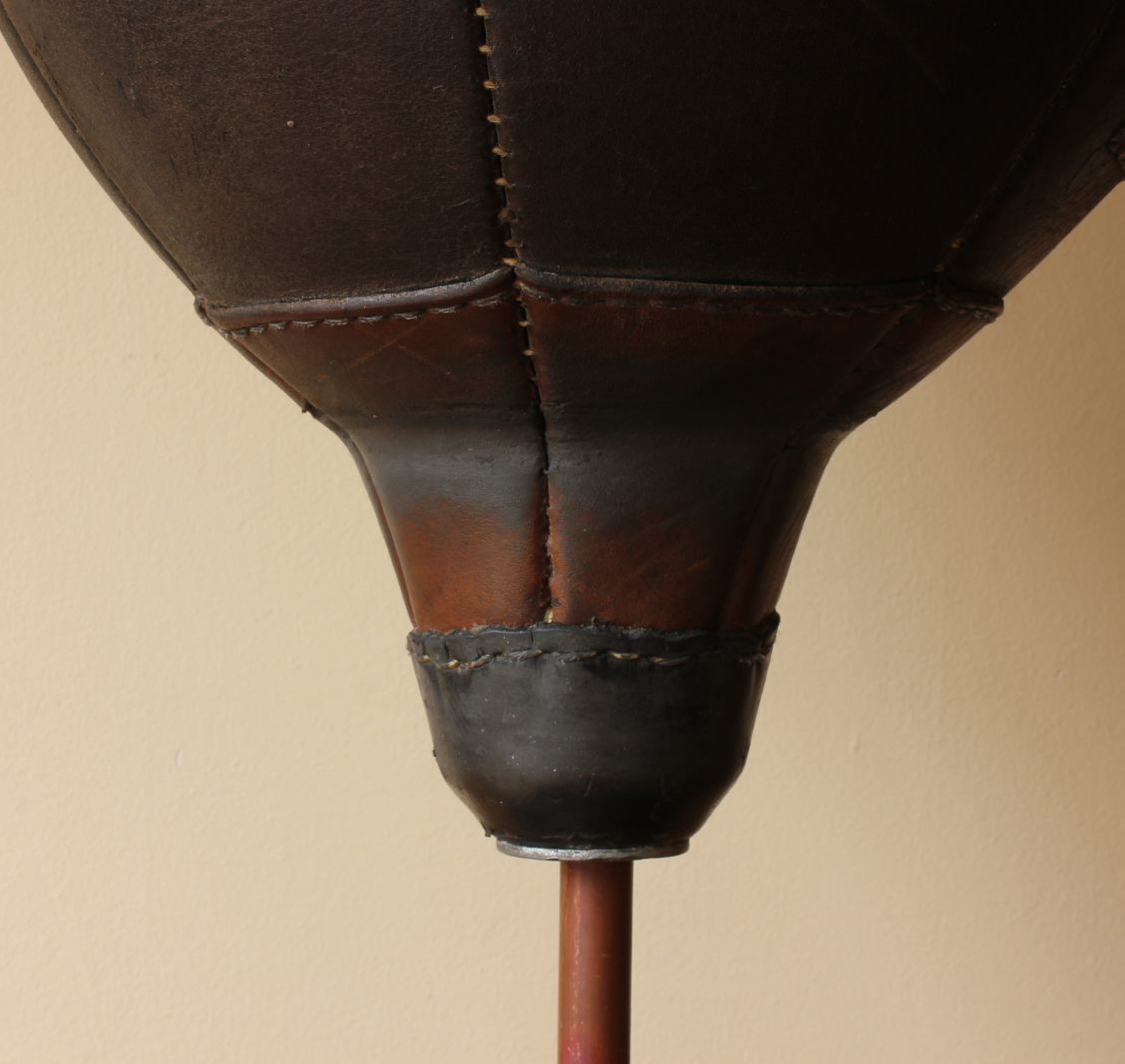 This vintage laced boxing ball which dates from the mid 20th century was originally used in a boxing punch ball arcade game in France but has now been mounted on a contemporary heavy brass base so makes a super decorative item for a mancave, gym, shop, bar or prop.