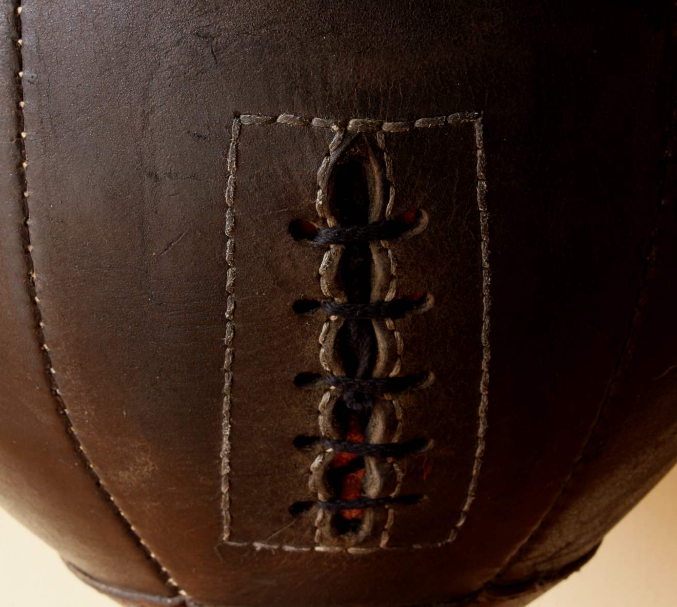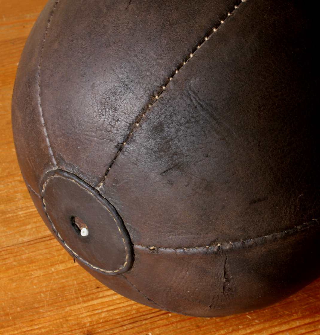 This great decorative vintage piece that is made of thick brown leather has a laced hole that holds an inner bladder which is fitted inside, inflated and holds air.