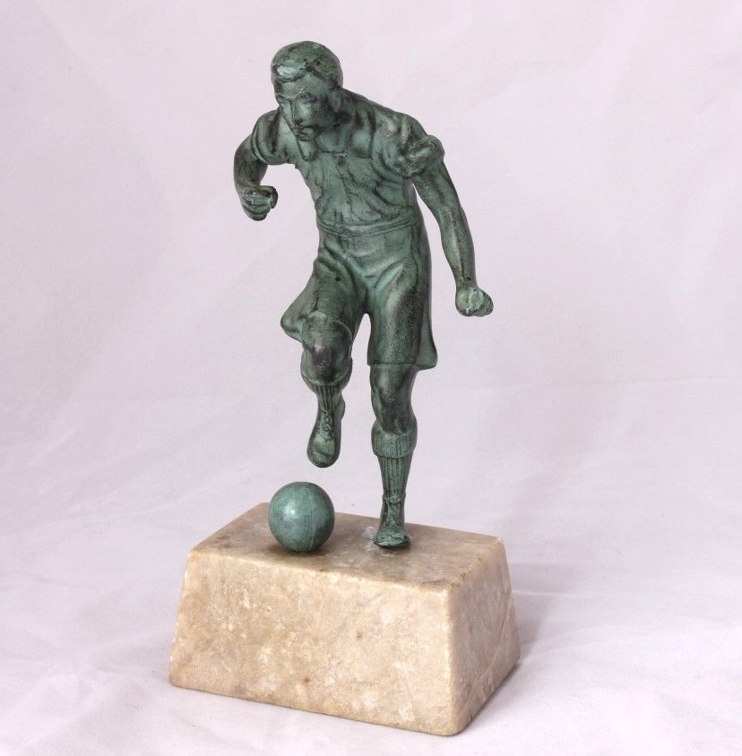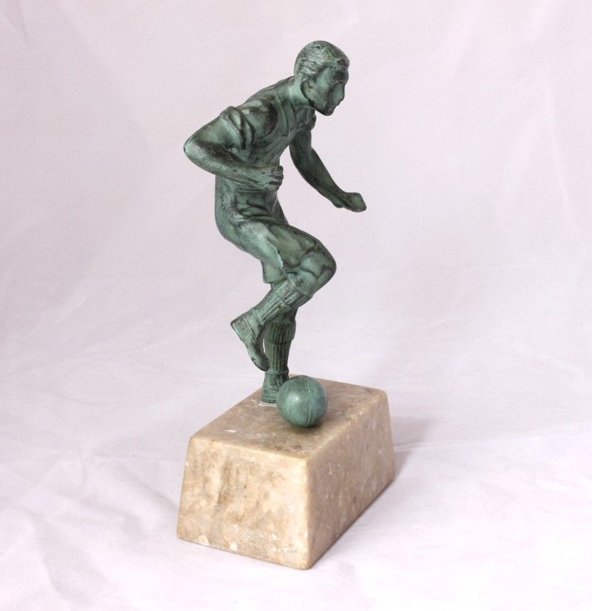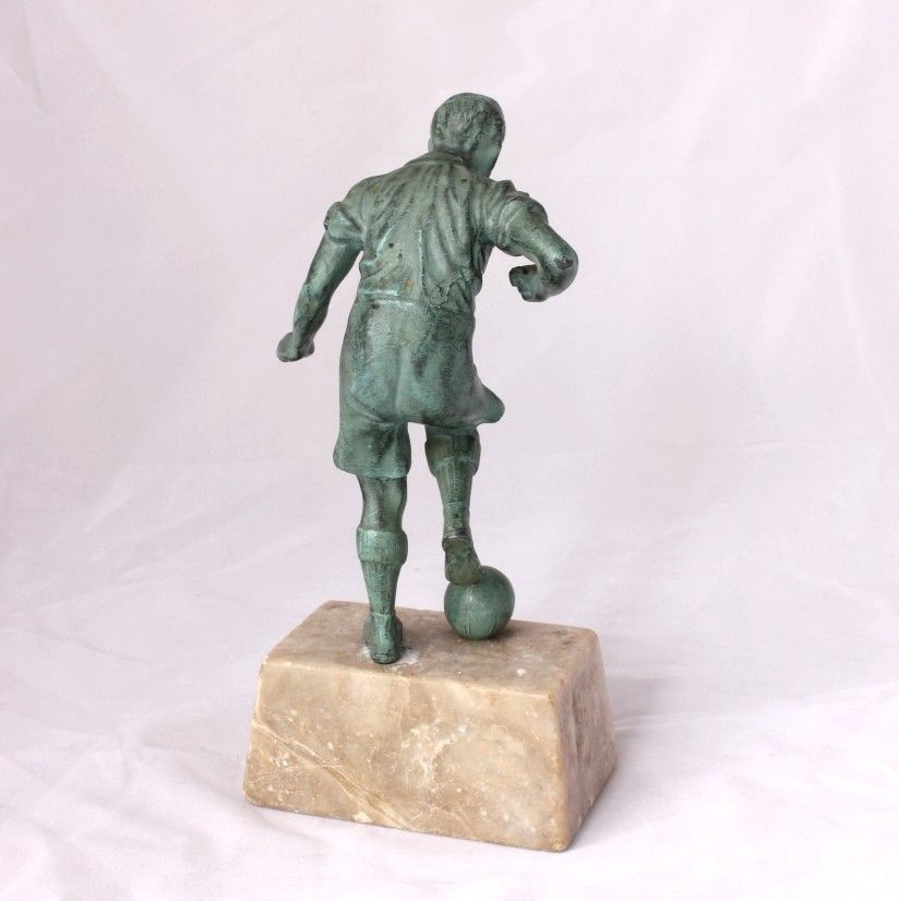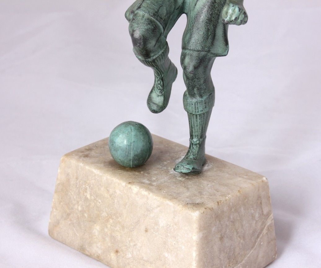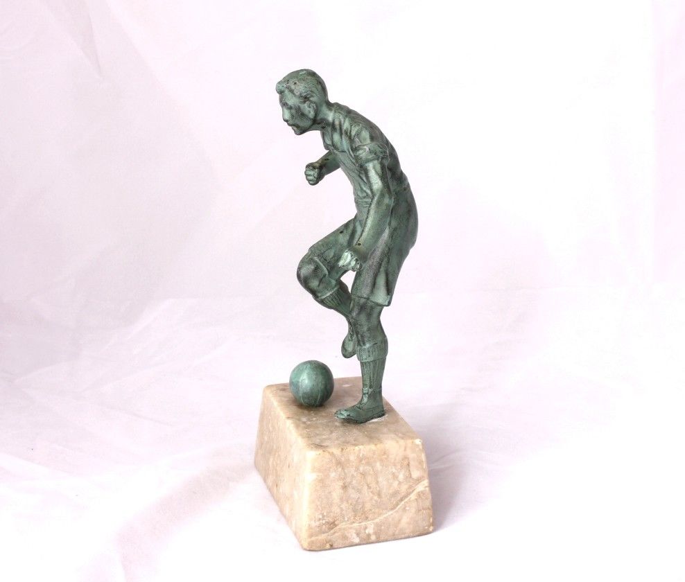 This original vintage french football statue is of an early style player about to kick a football. It is made of cast metal with a patinated bronze effect finish and is mounted on a beige marble base.