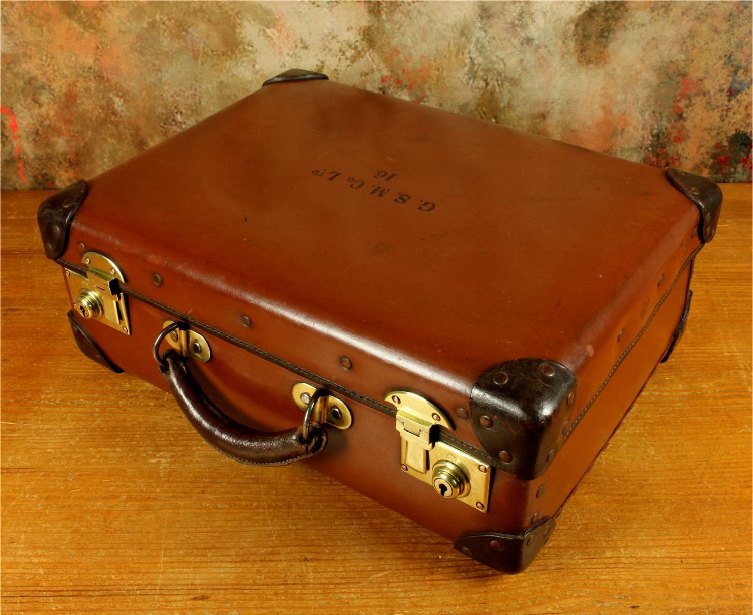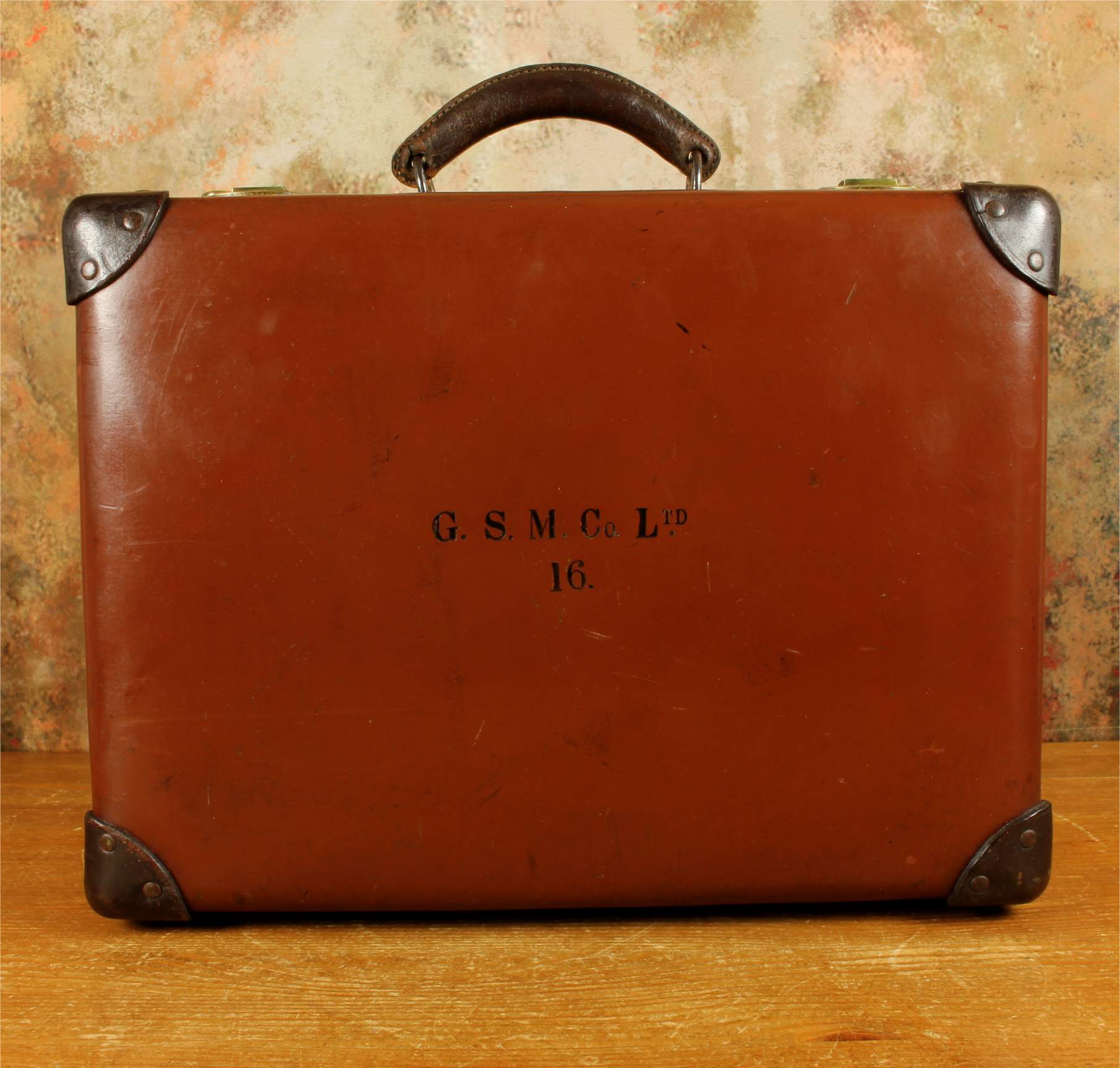The inside of the case is in beautiful condition and fitted with a tan lining with a folio compartment. The outside is embossed with G.S.M. Co Ltd. 16.