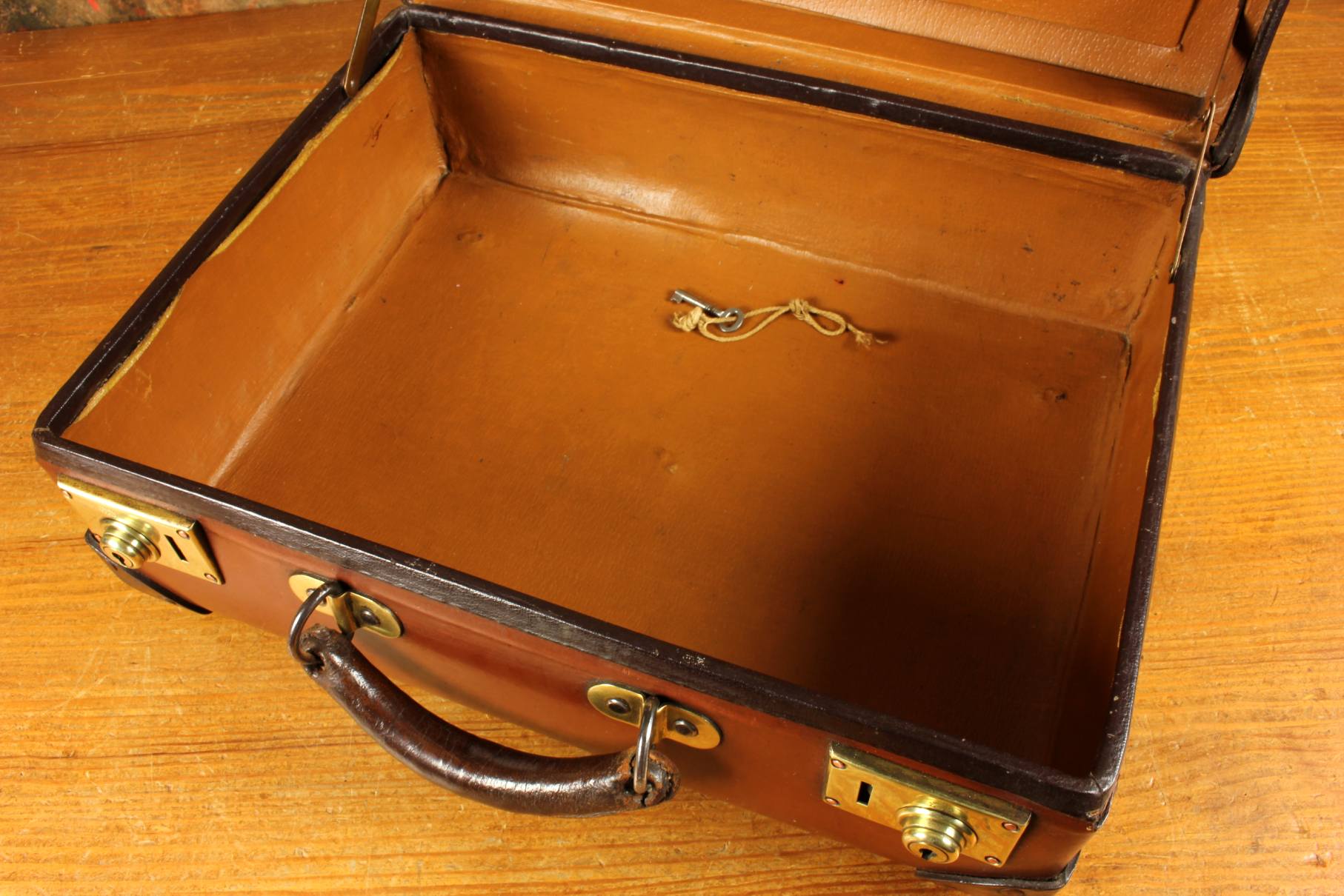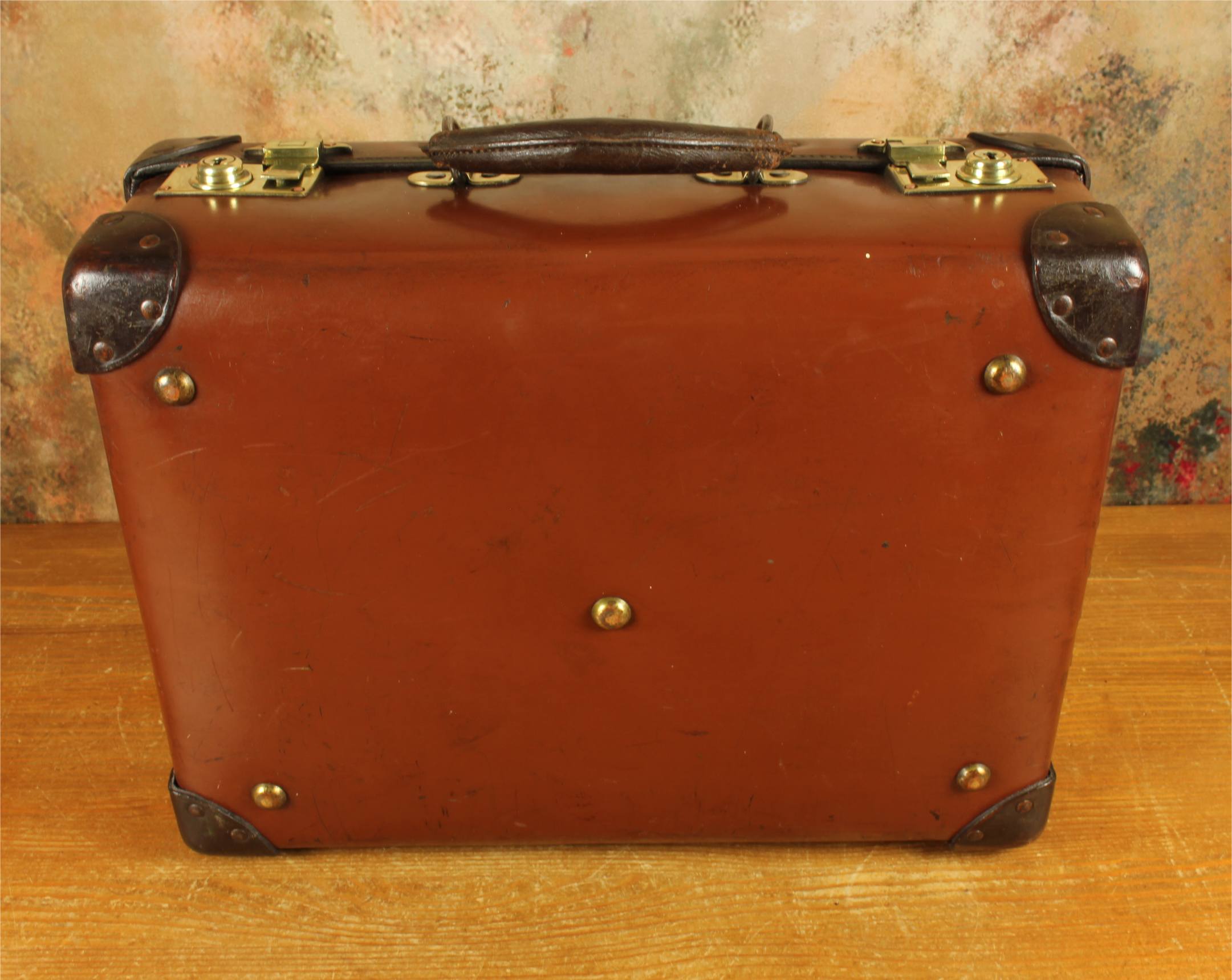 This vintage / antique attache case is strong, durable, lightweight and fire retardant being made from vulcanised fibre, has studded corner strengtheners, a stitched leather metal reinforced handle with sturdy brass fittings, two brass locks/clasps which are marked English Lever and we have the key.