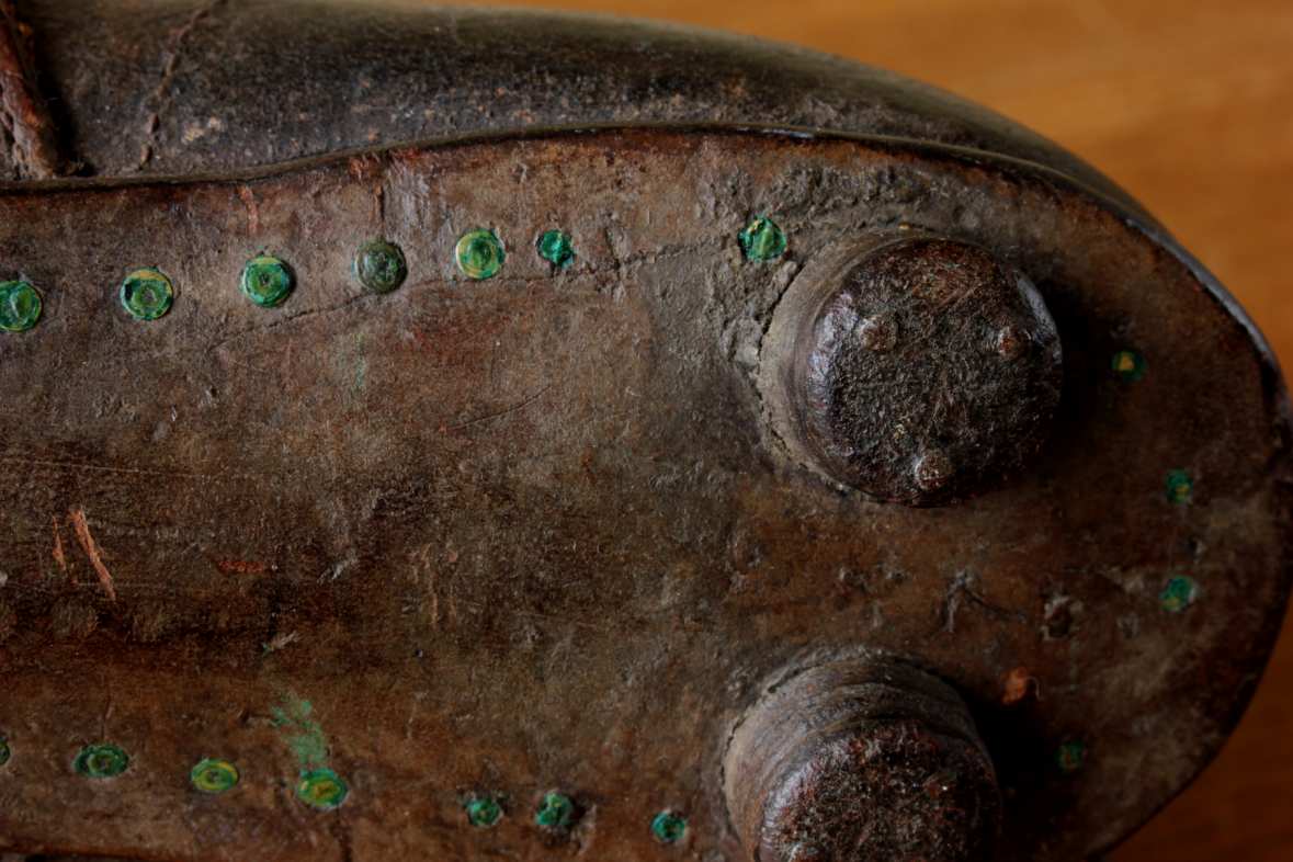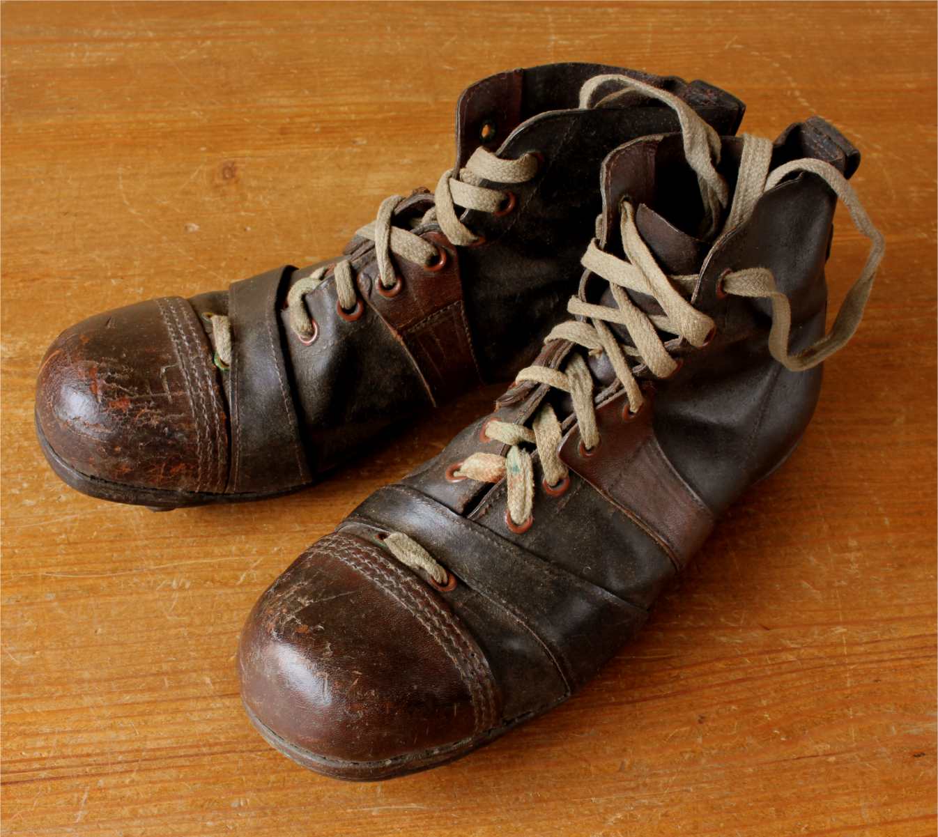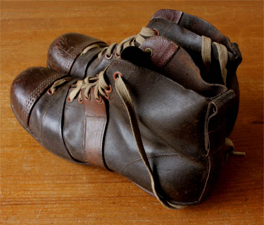This very nice pair of brown leather football boots which date from c1940 have leather soles with nailed on leather studs and cord laces.