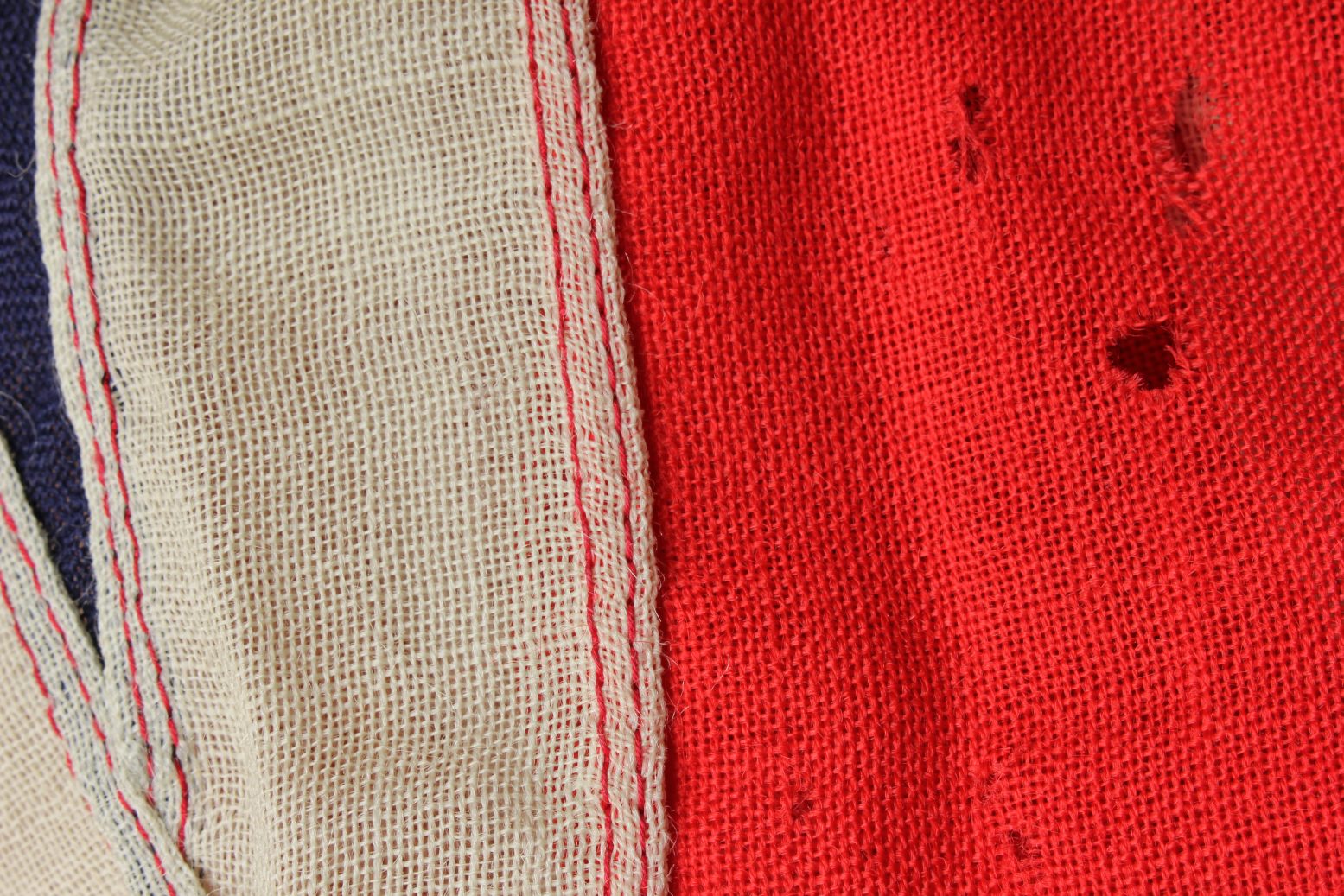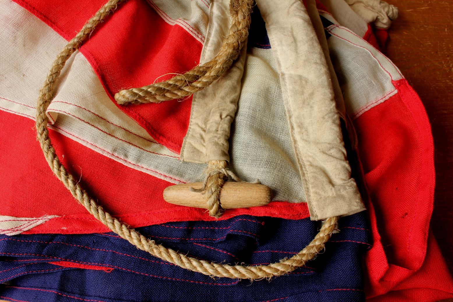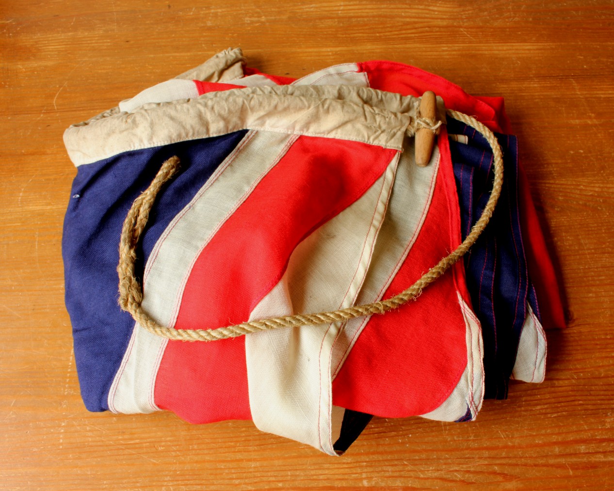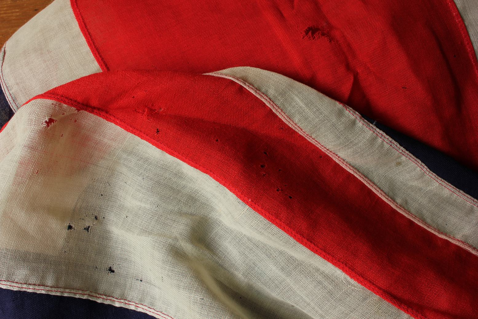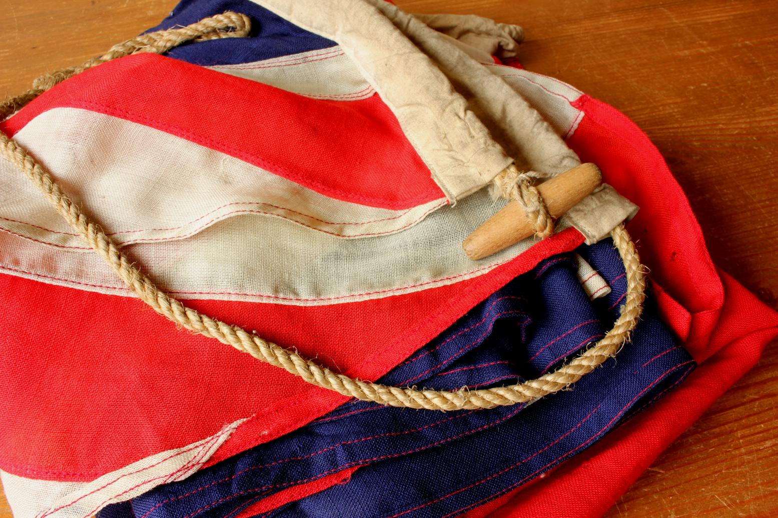 This large original vintage Union Jack Flag which dates from the first half of the 20th century is a nice size at 8 1/2 feet in length, has halyard rope with a wooden toggle and each segment is individually sewn.