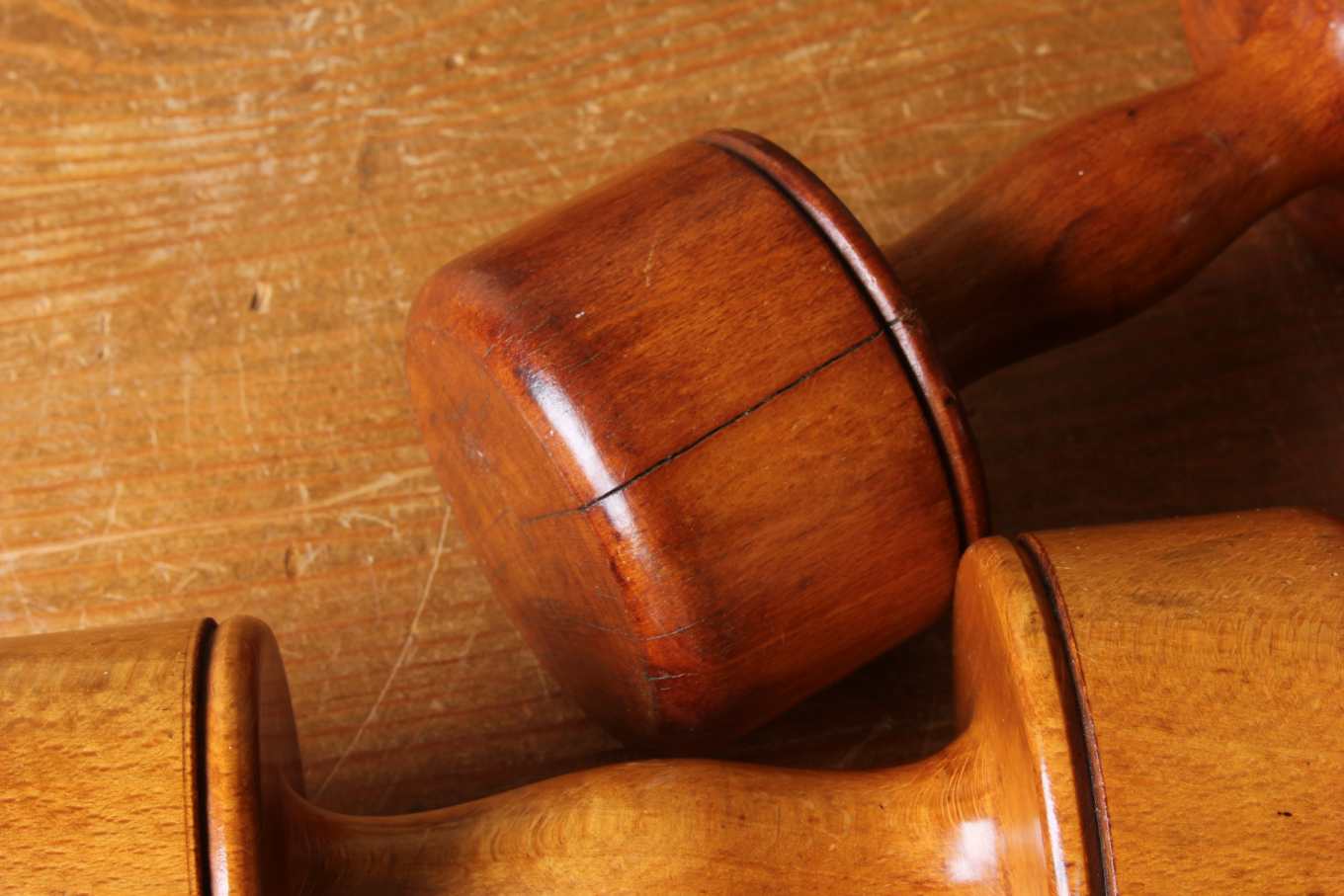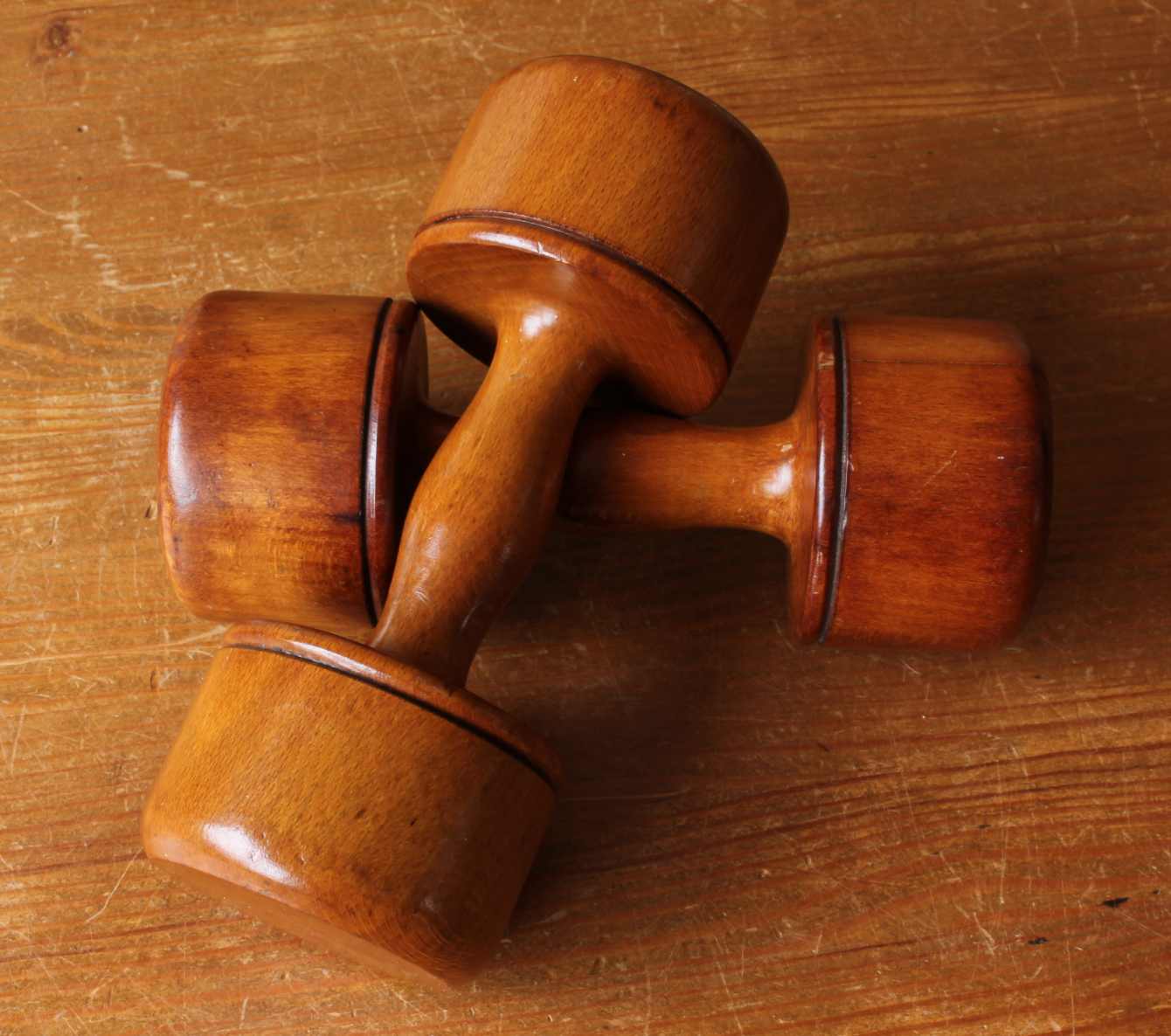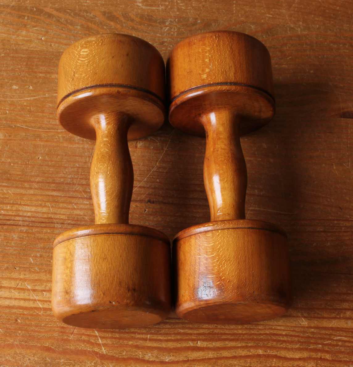 This handsome pair of wooden dumbbell exercise weights which have a beautiful golden patina and colour date from the early 1900's and each has a weight of approx 420 grams.