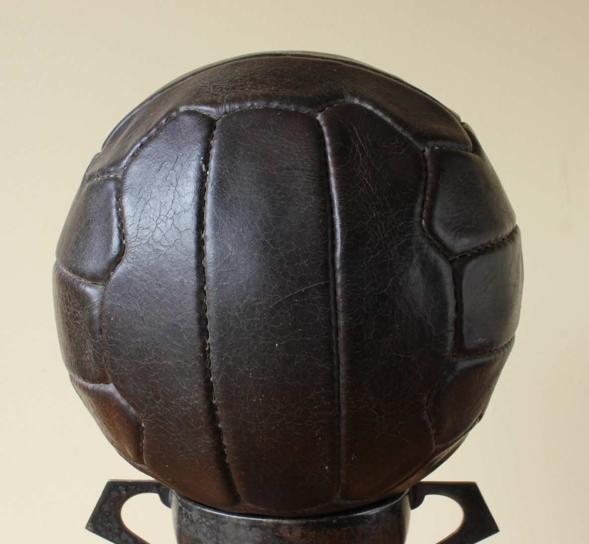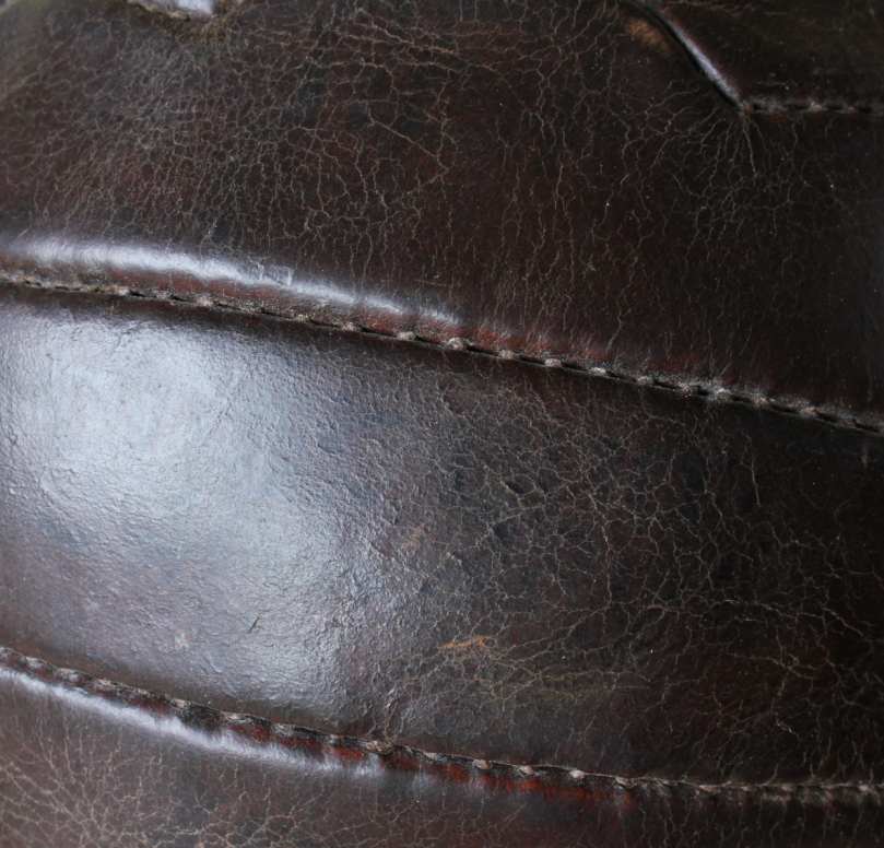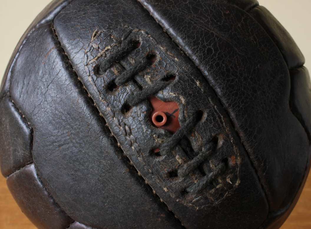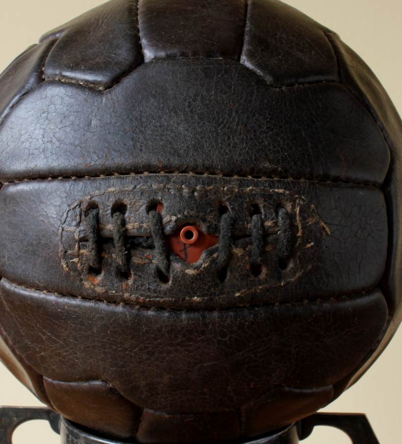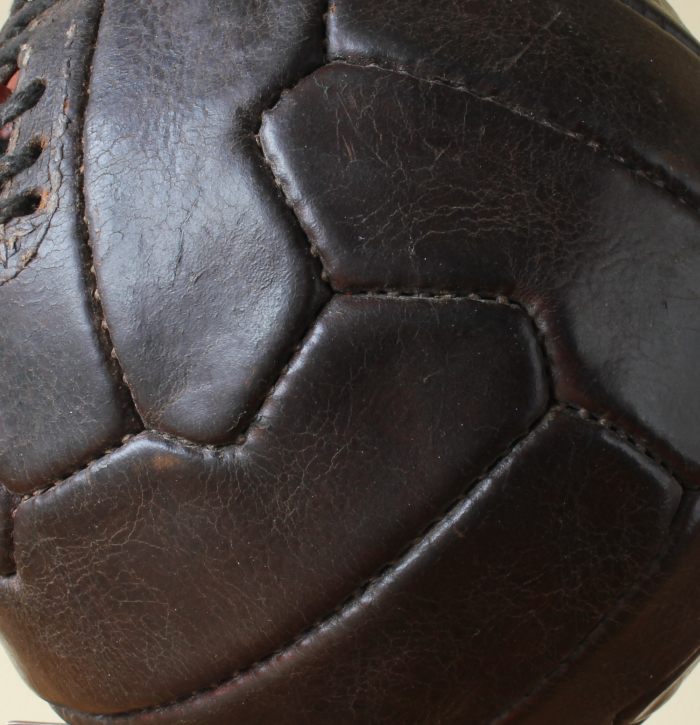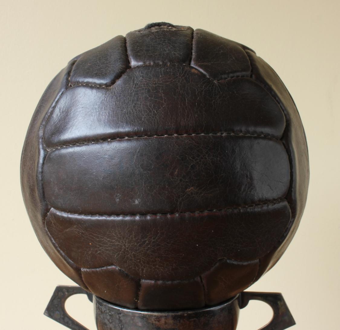 This great looking vintage football that is made of dark brown leather dates from c1950, has 18 stitched zig zag shaped panels and 6 pairs of lace holes.