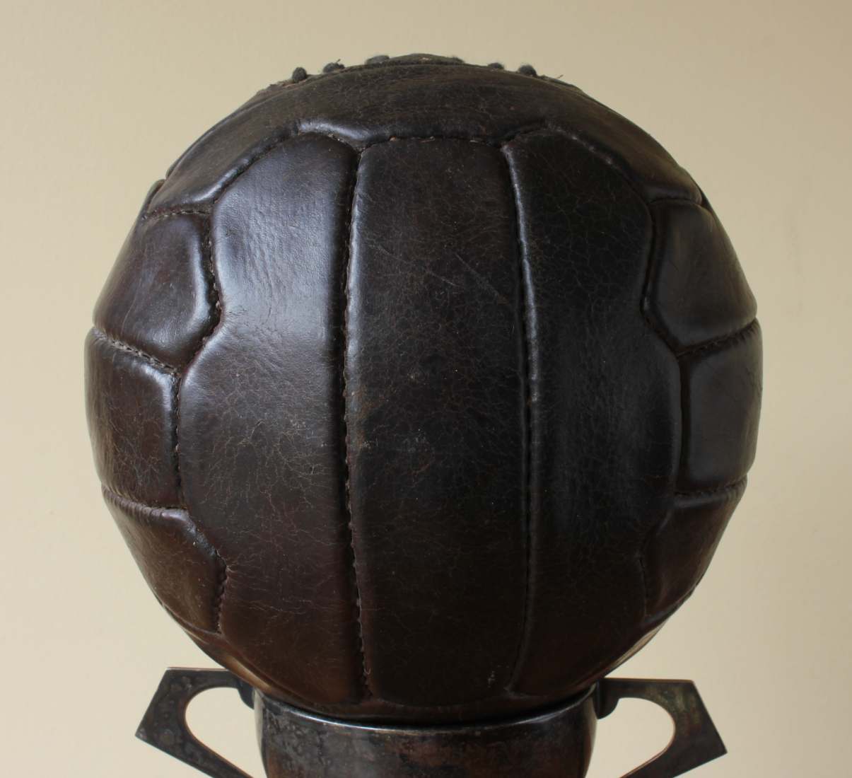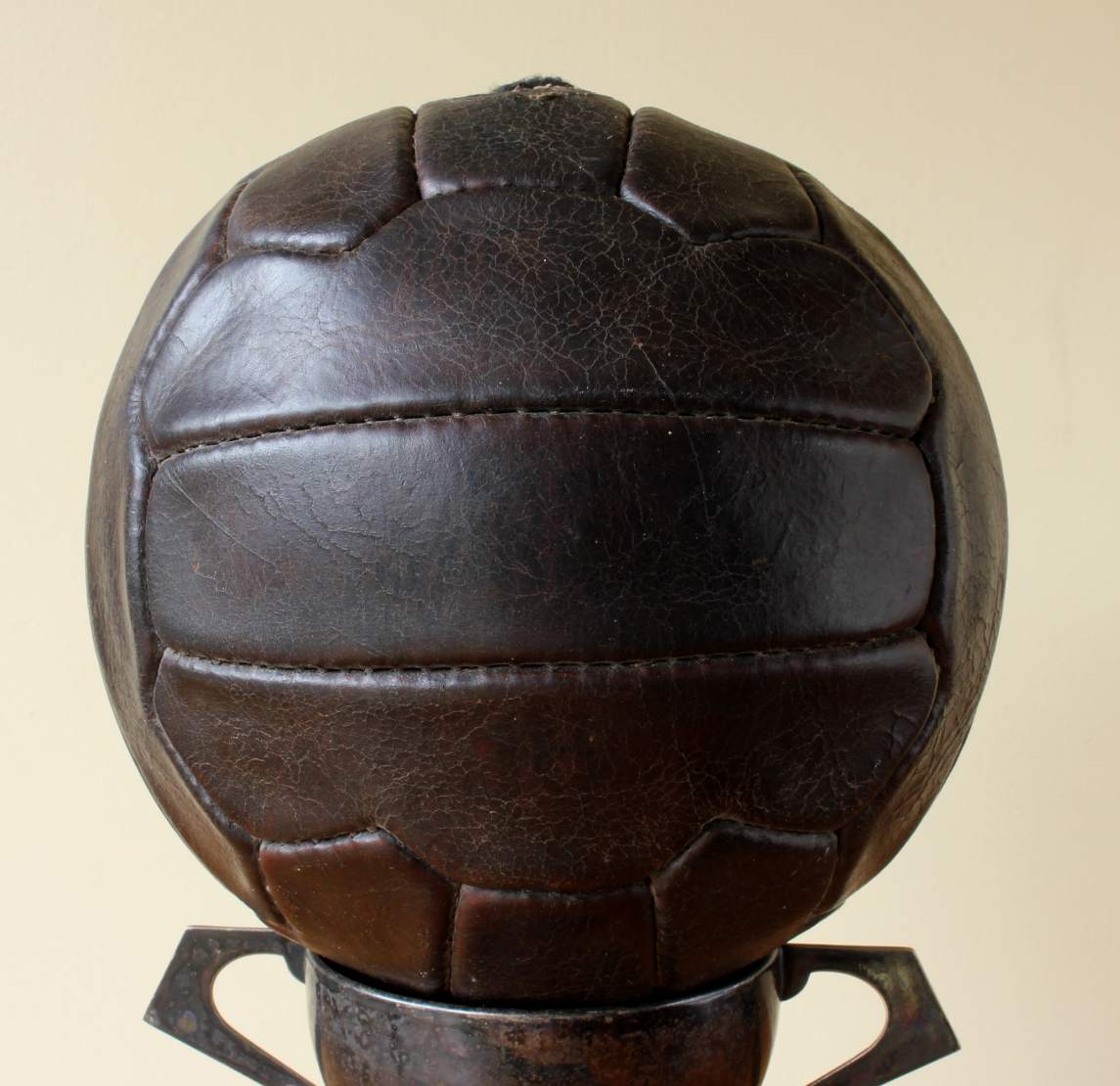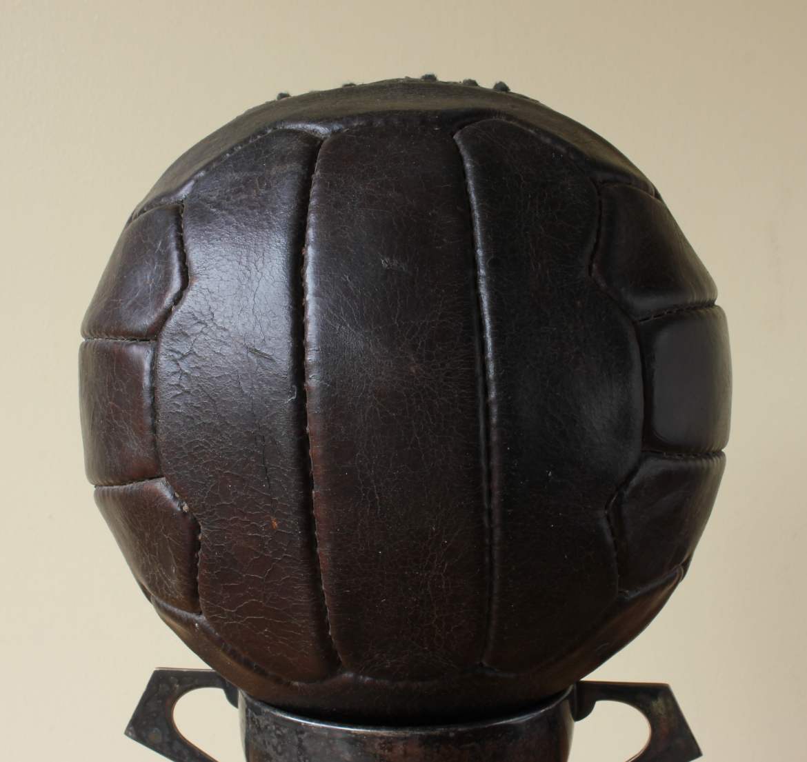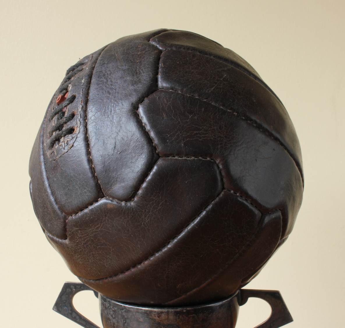 This great looking vintage football that is made of dark brown leather dates from c1950, has 18 stitched zig zag shaped panels and 6 pairs of lace holes.