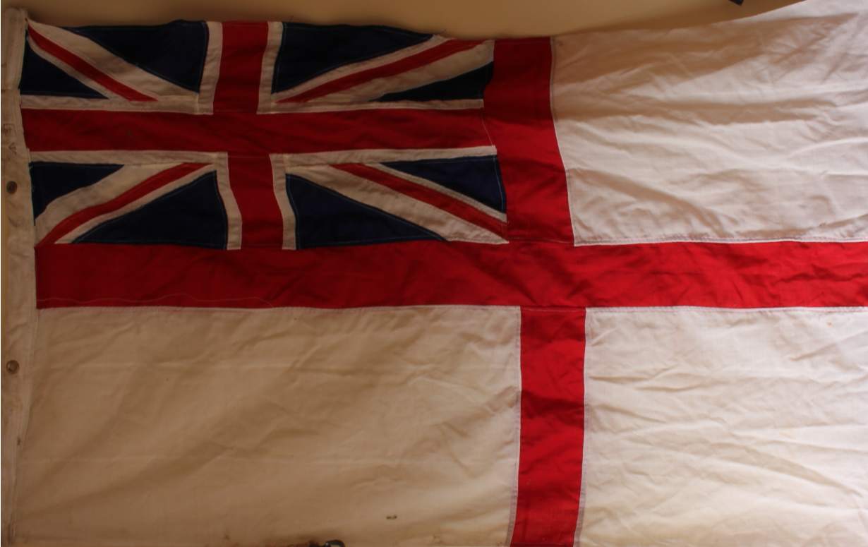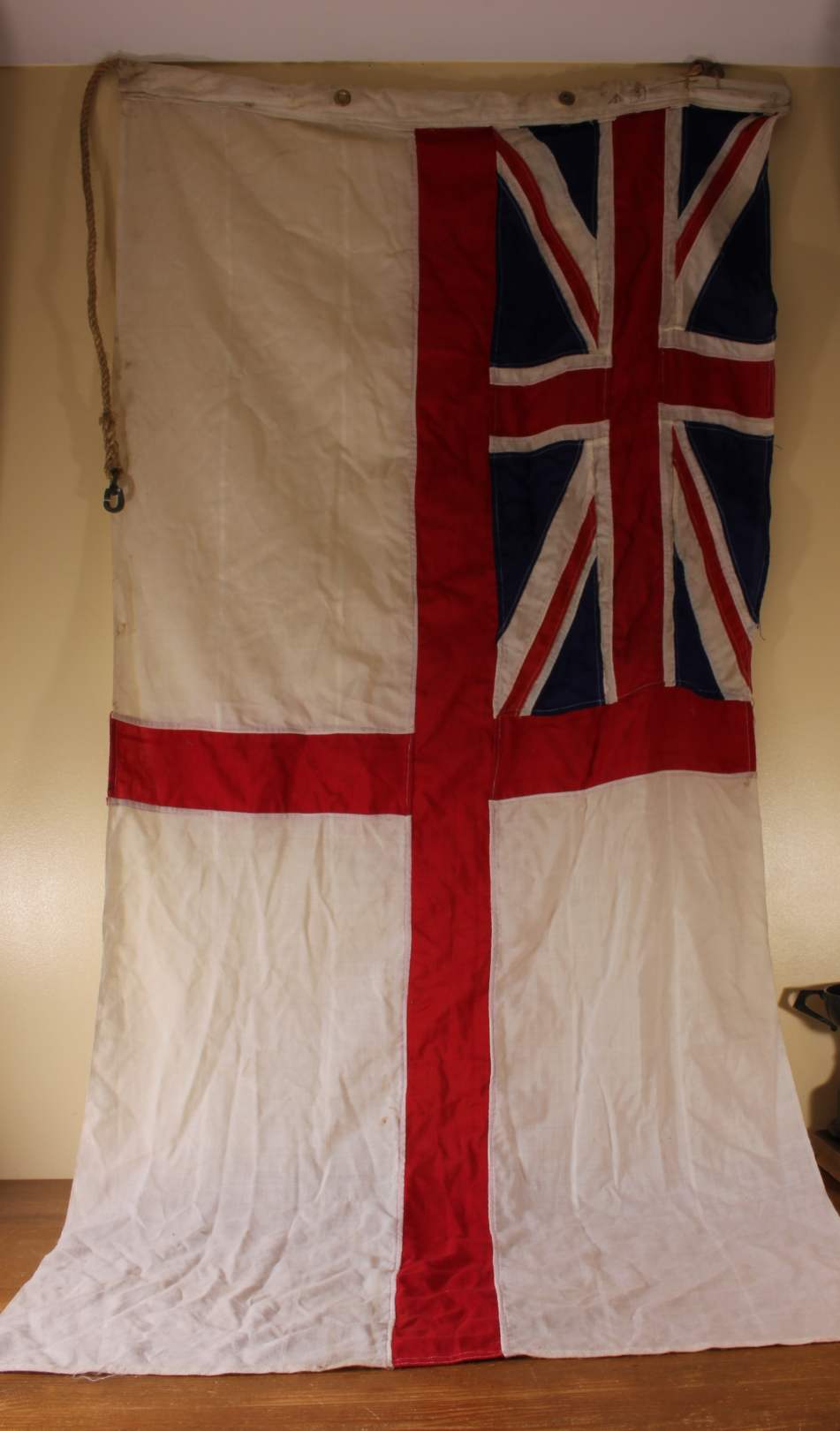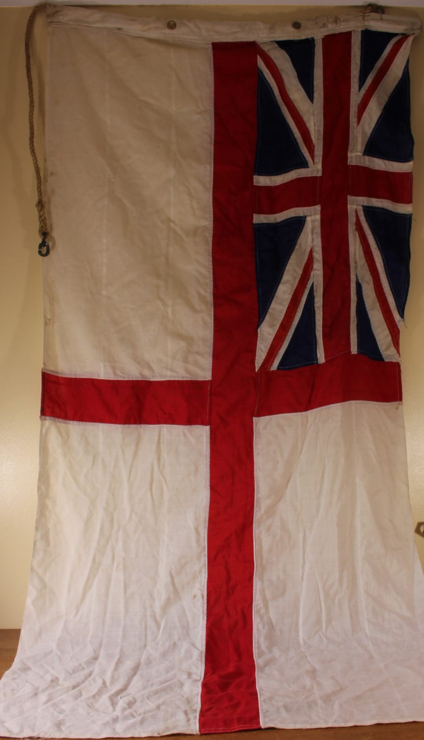 The flag which is a good size at 6 feet in length would have been used on board a Royal Naval ship and is marked with white ensign and the number 4.
