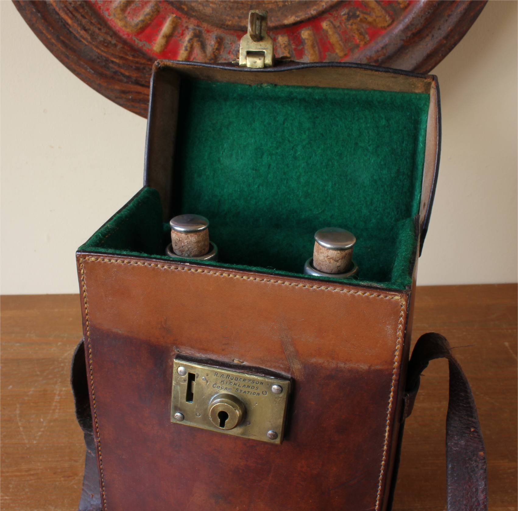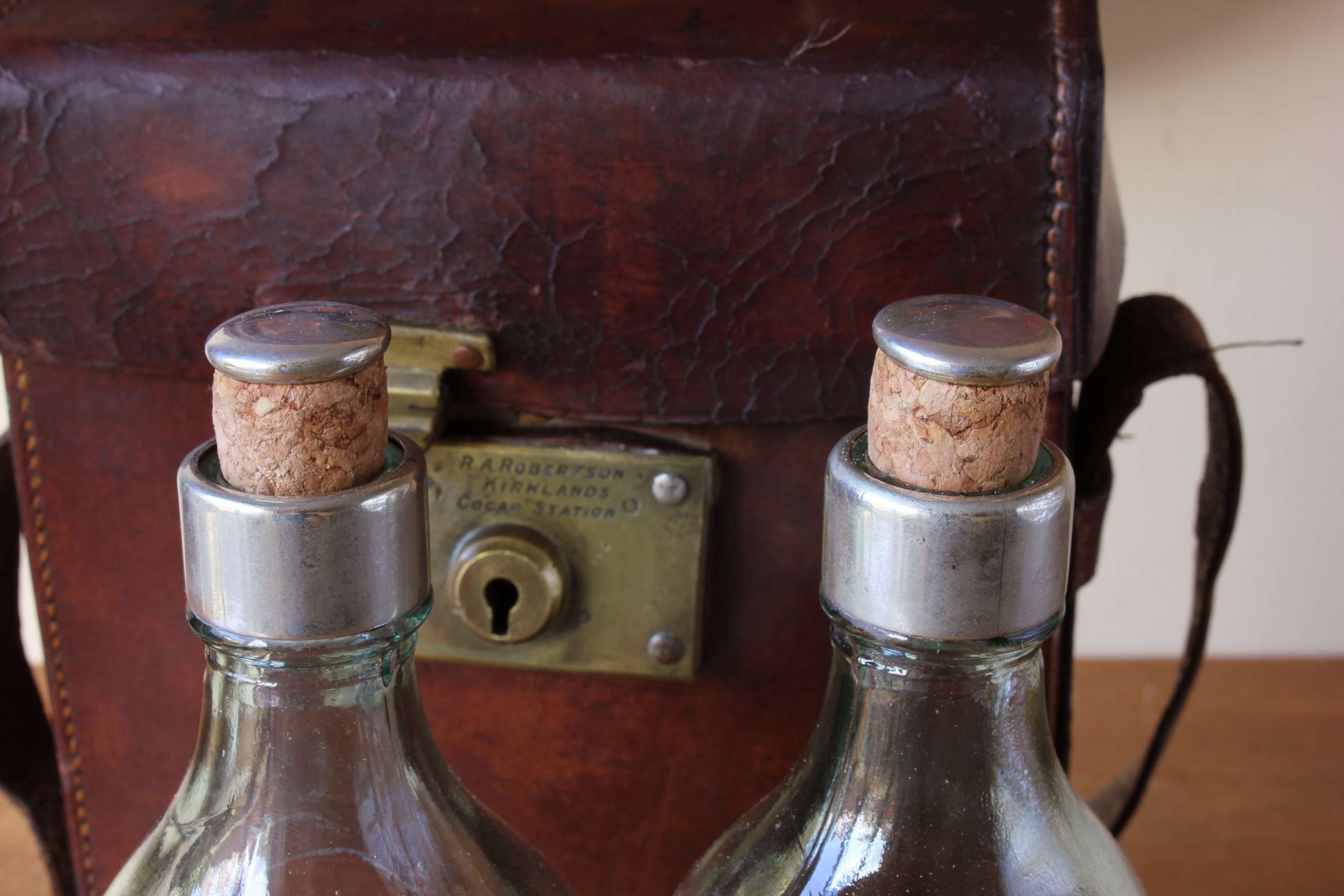 Marks: Engraved to brass lock with: RA Robertson Kirklands Gogar Station. Marked to bottoms of the two Whisky bottles with Walkers, Kilmarnock Whisky and their batch numbers or 1800 and 1915.
