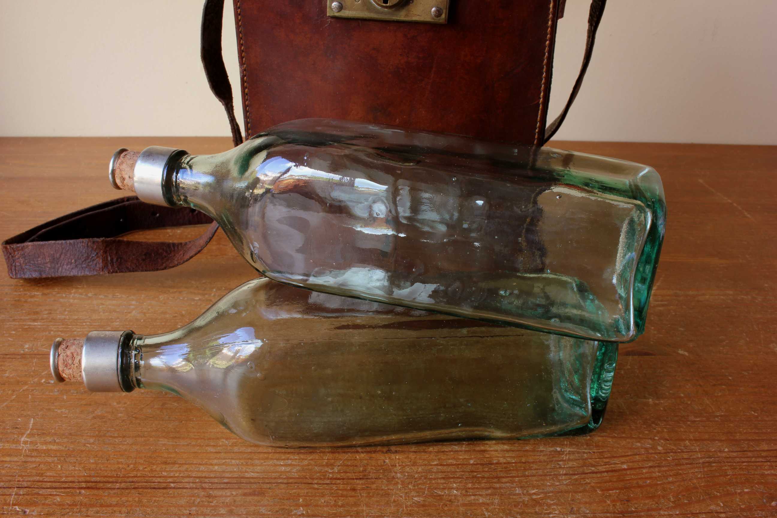 This case comes complete with it's two large glass whisky bottles which have white metal collars and corks ends. These bottles are made of beautiful old green glass which show their bubbles and swirls from manufacture, are square in shape and are marked to the bottoms with Walkers, Kilmarnock Whisky and with their batch numbers. These fit snugly and safely inside the leather case which has an inner partition to keep the bottles separate.