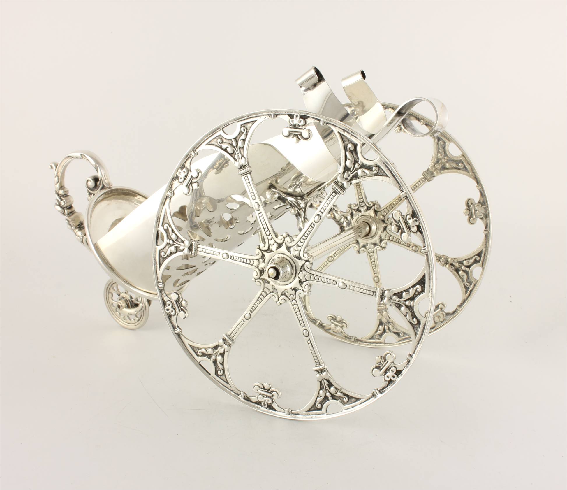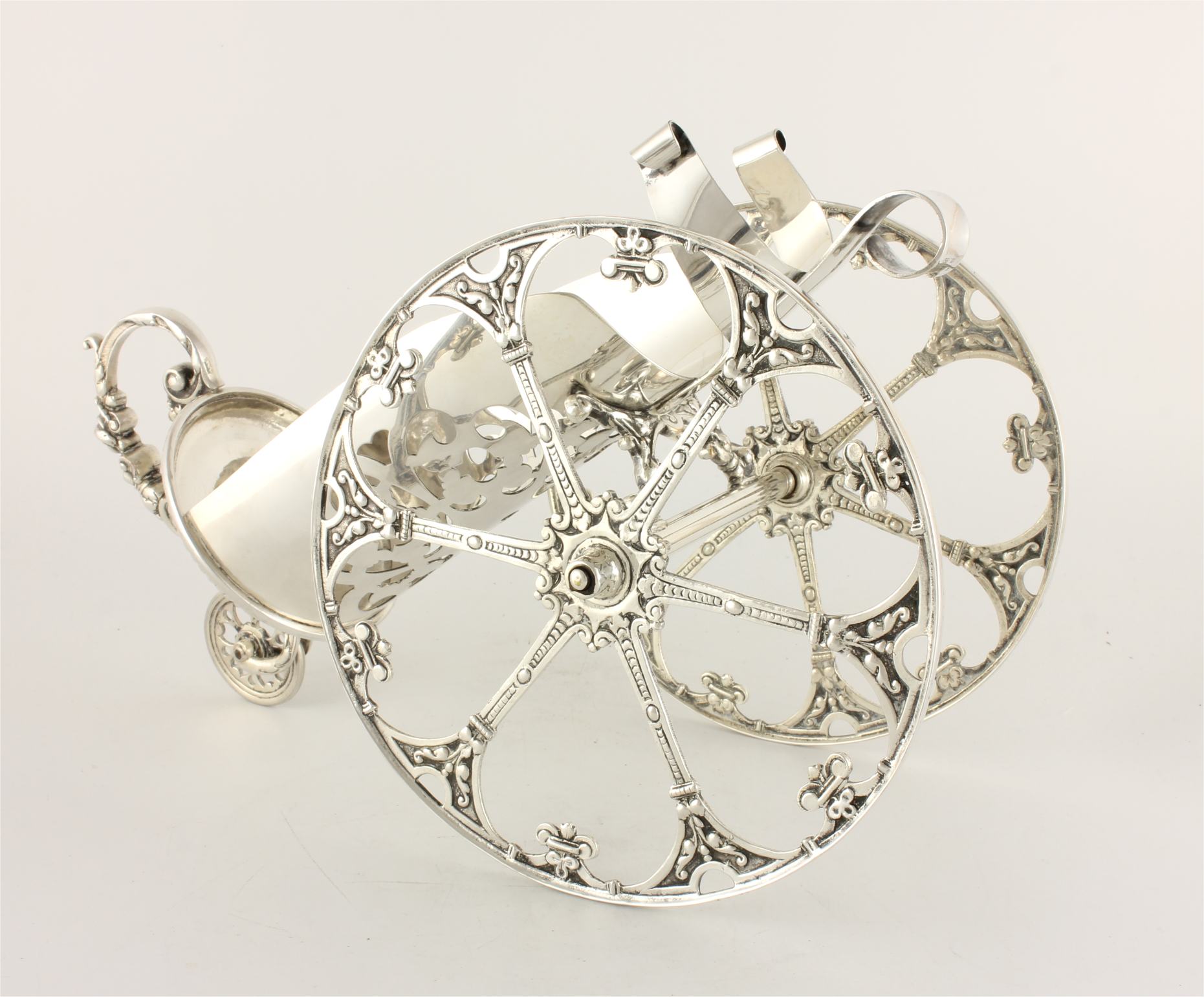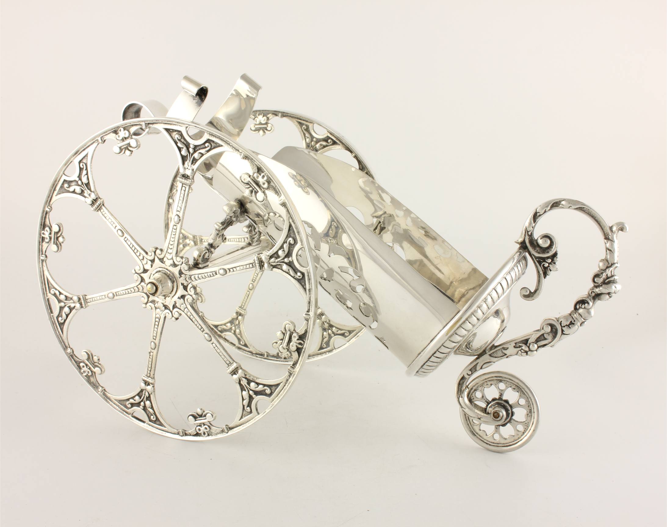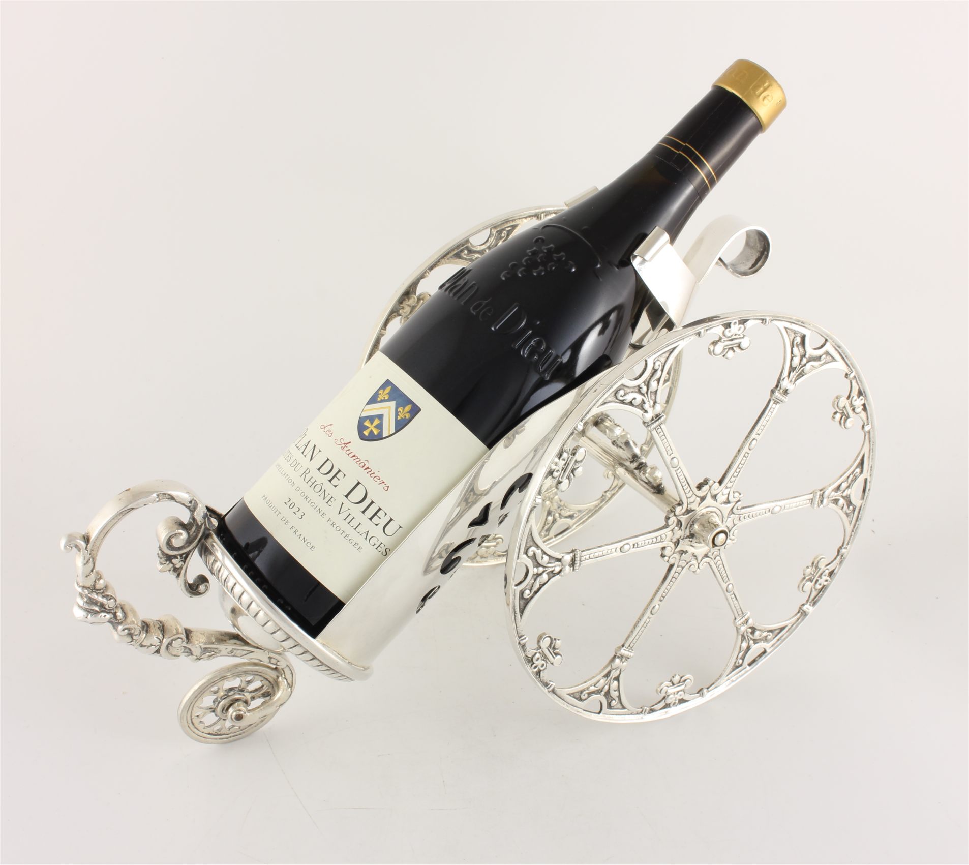 This very nice quality wine bottle holder which has two large side wheels has a smaller rear wheel so you can wheel your bottle across a table to serve. The smaller wheel forms part of the handle which has a wonderful decorative pattern and your bottle can be secured in the pierced holder using the sprung clip.