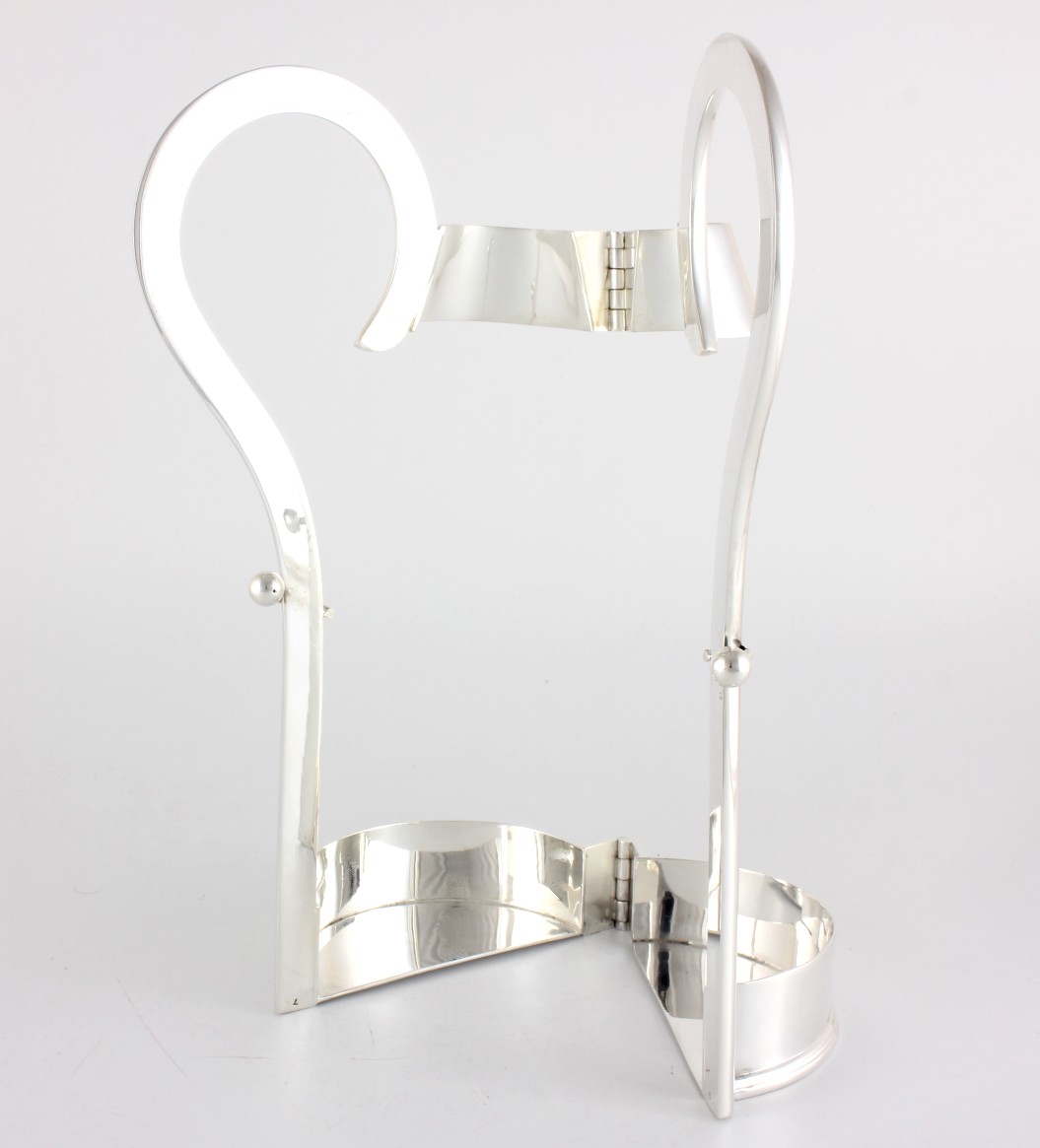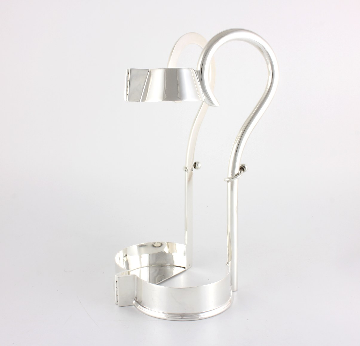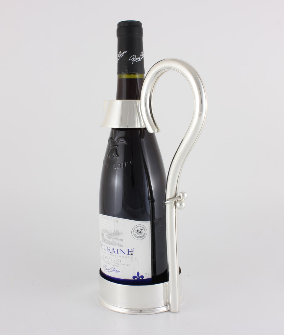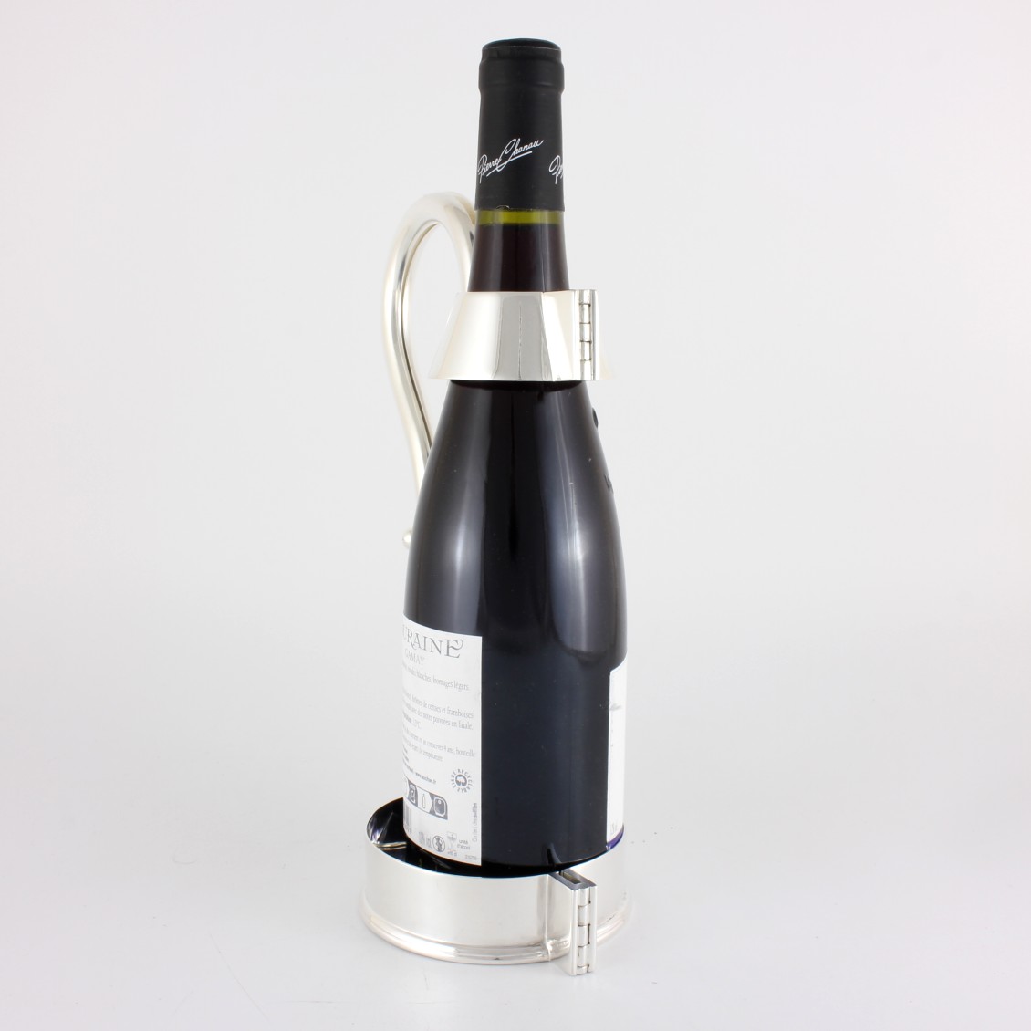 This handsome silver plated wine bottle holder which dates from the first half of the 20th century has a circular base and fastens at the rear to securely hold the bottle in place.