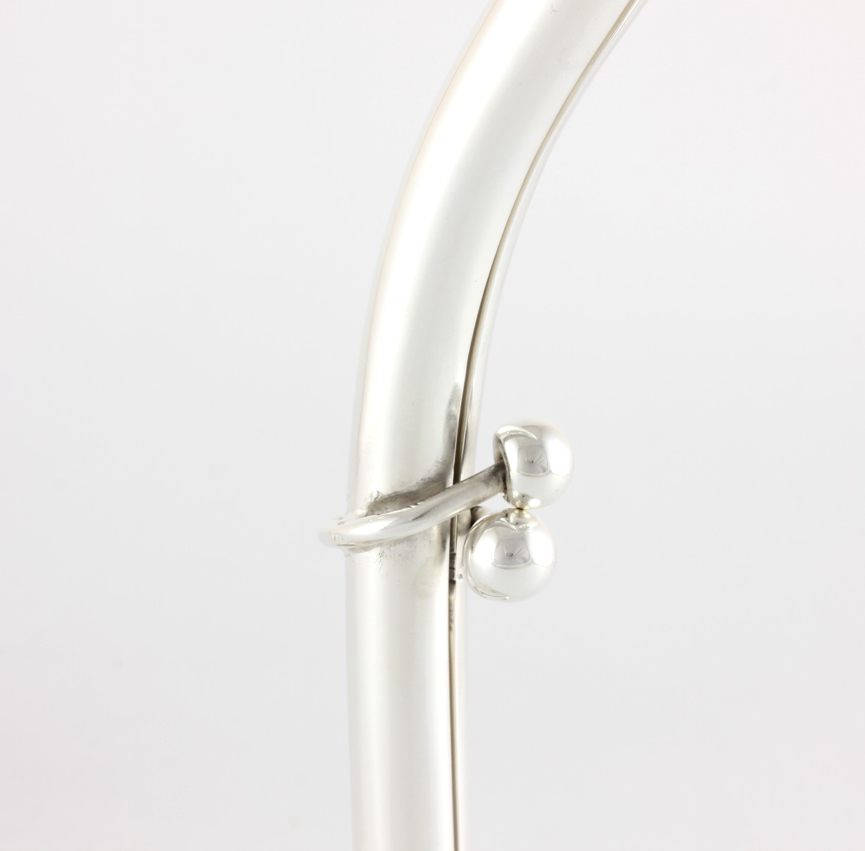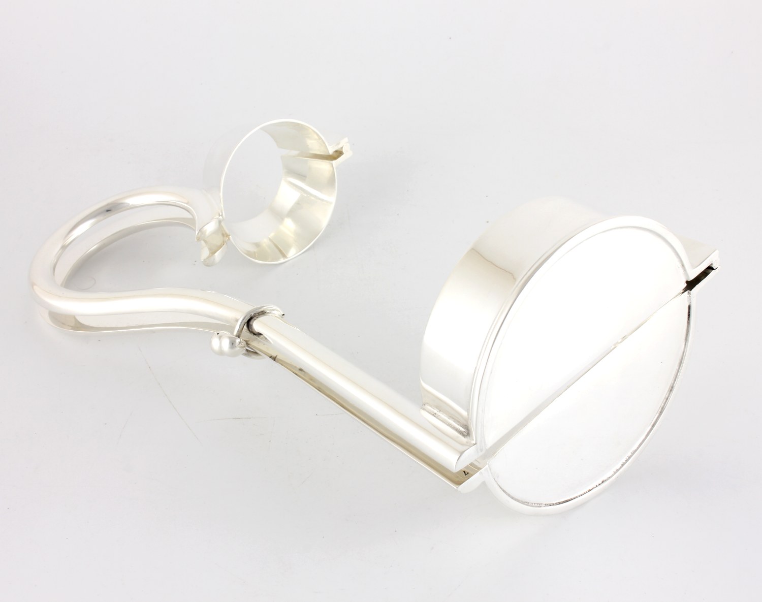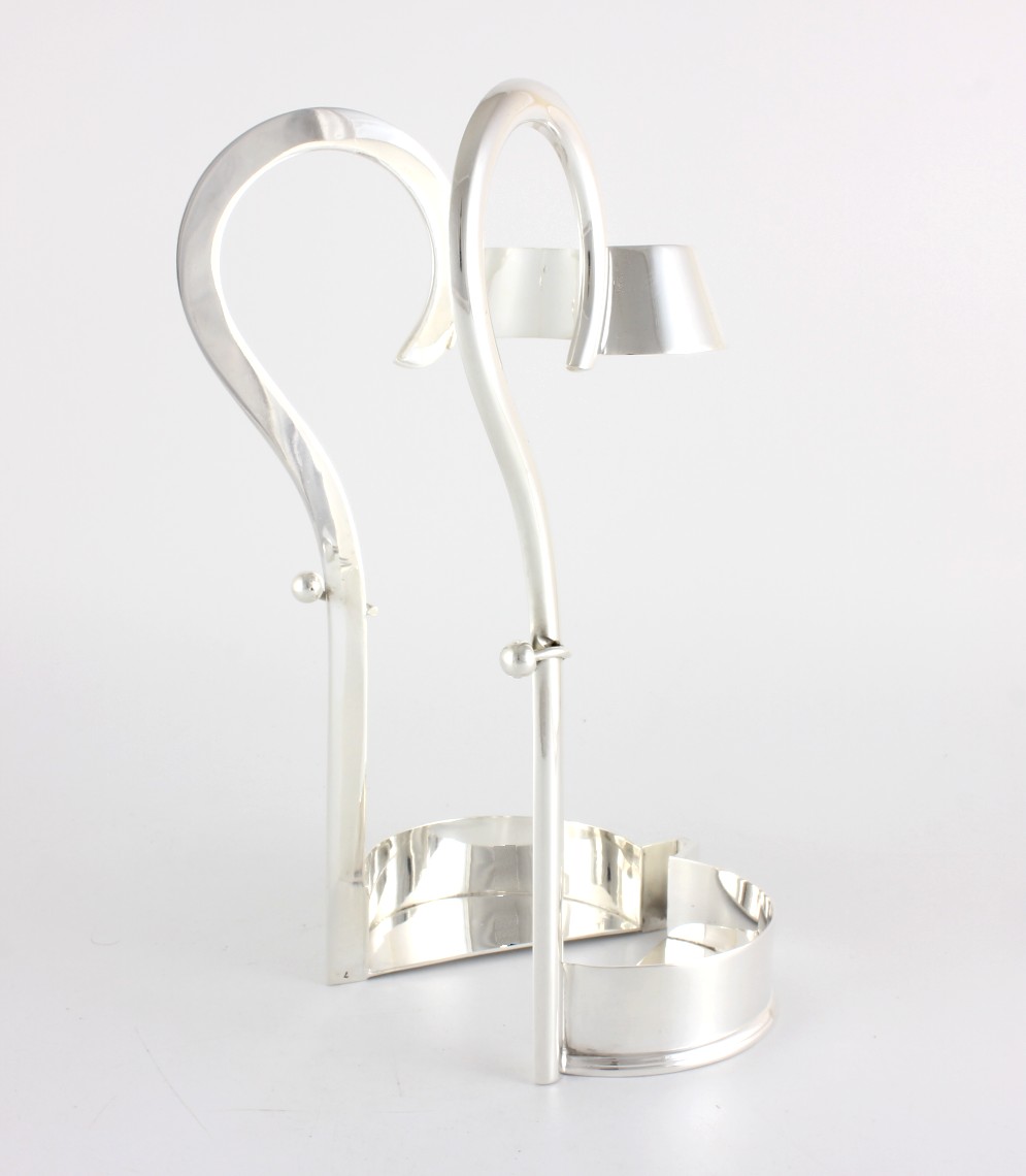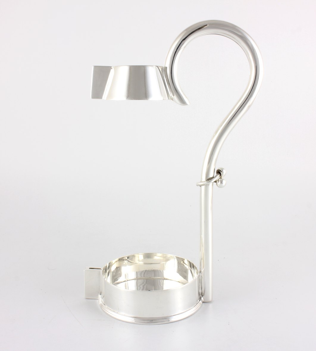 This handsome silver plated wine bottle holder which dates from the first half of the 20th century has a circular base and fastens at the rear to securely hold the bottle in place.