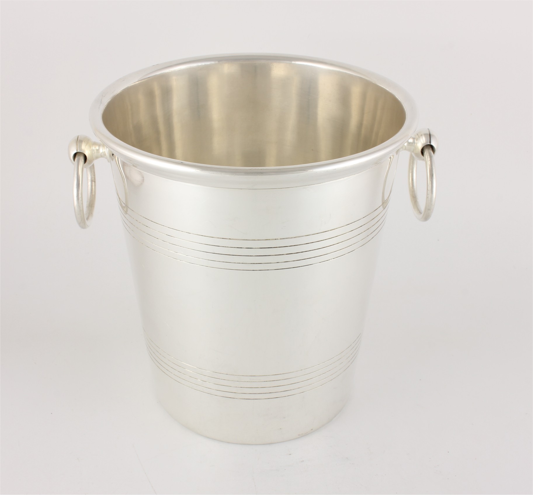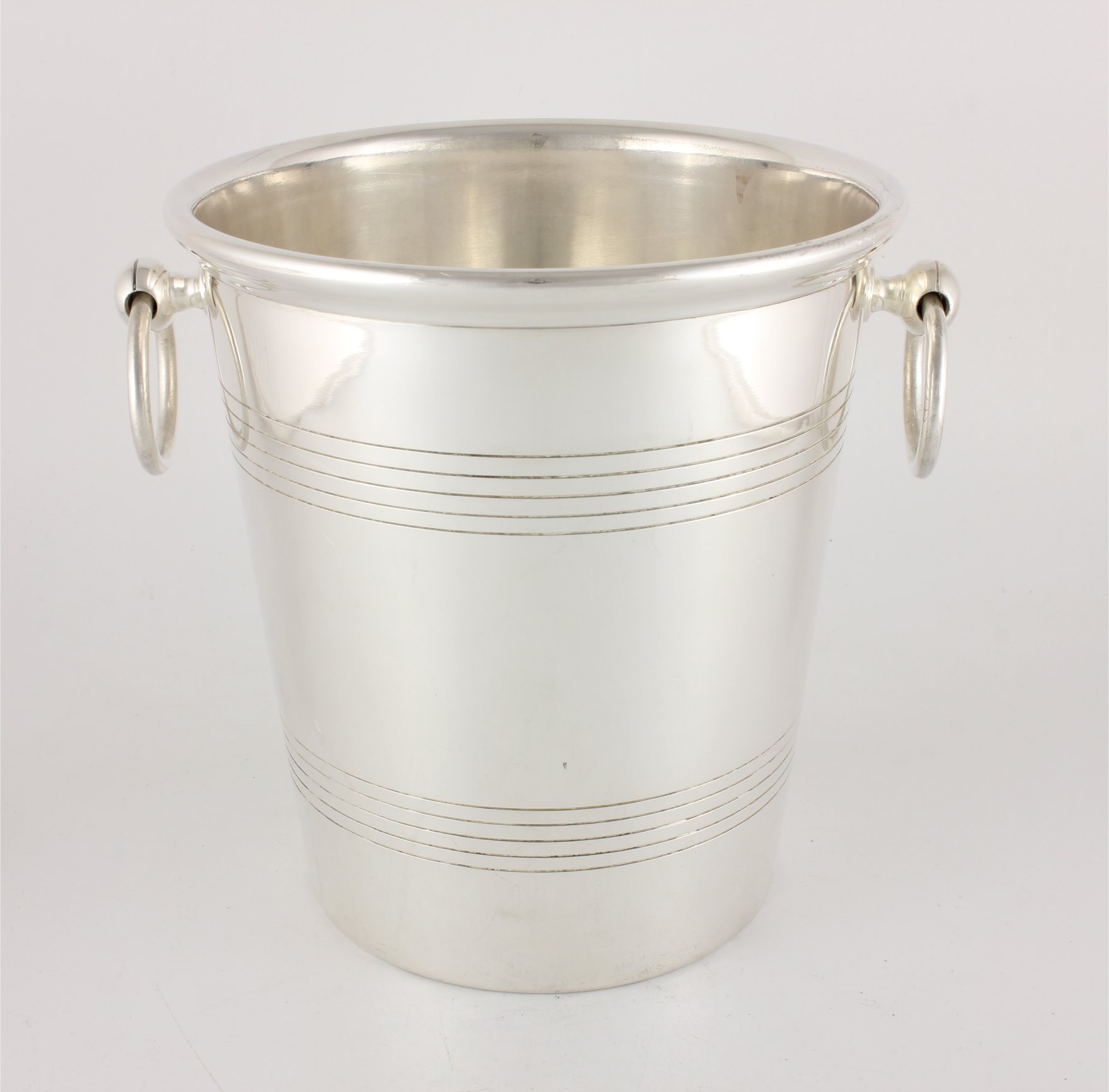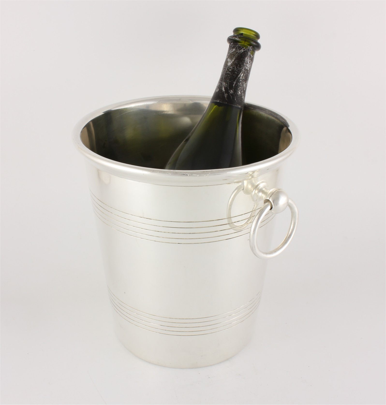 This vintage wine bucket has a decorative ring design to the body, two ring handles to the sides and the underside is marked with the maker's marks.