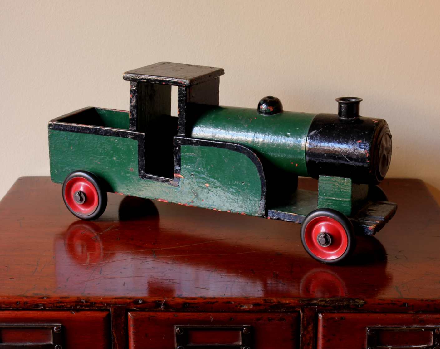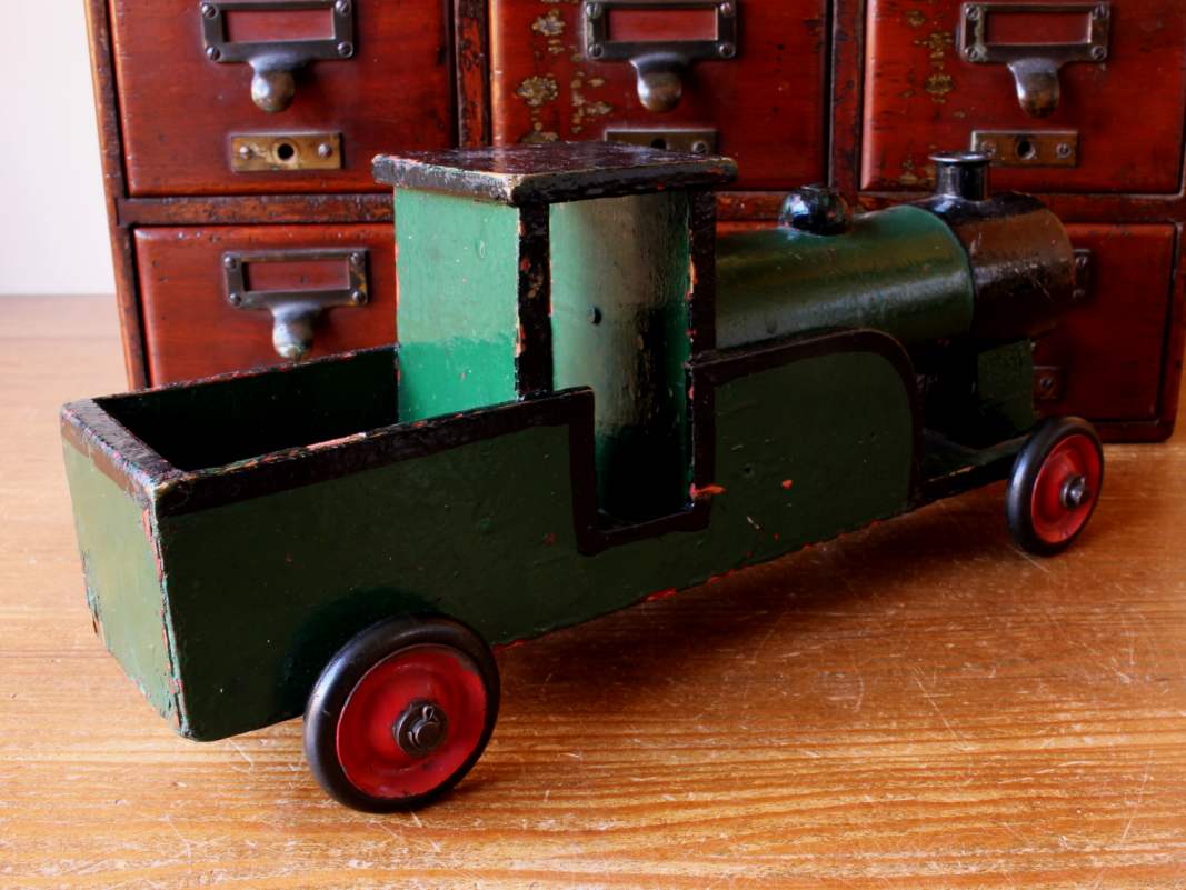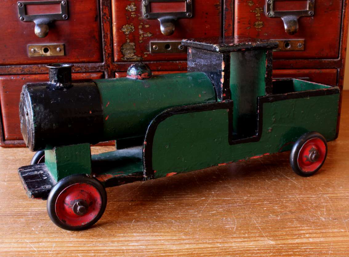 This handsome vintage model of a steam train which is made of wood is painted in green and black and has a wonderful look.