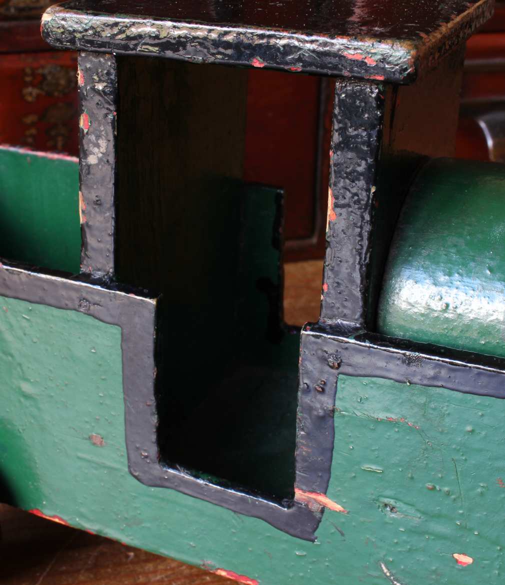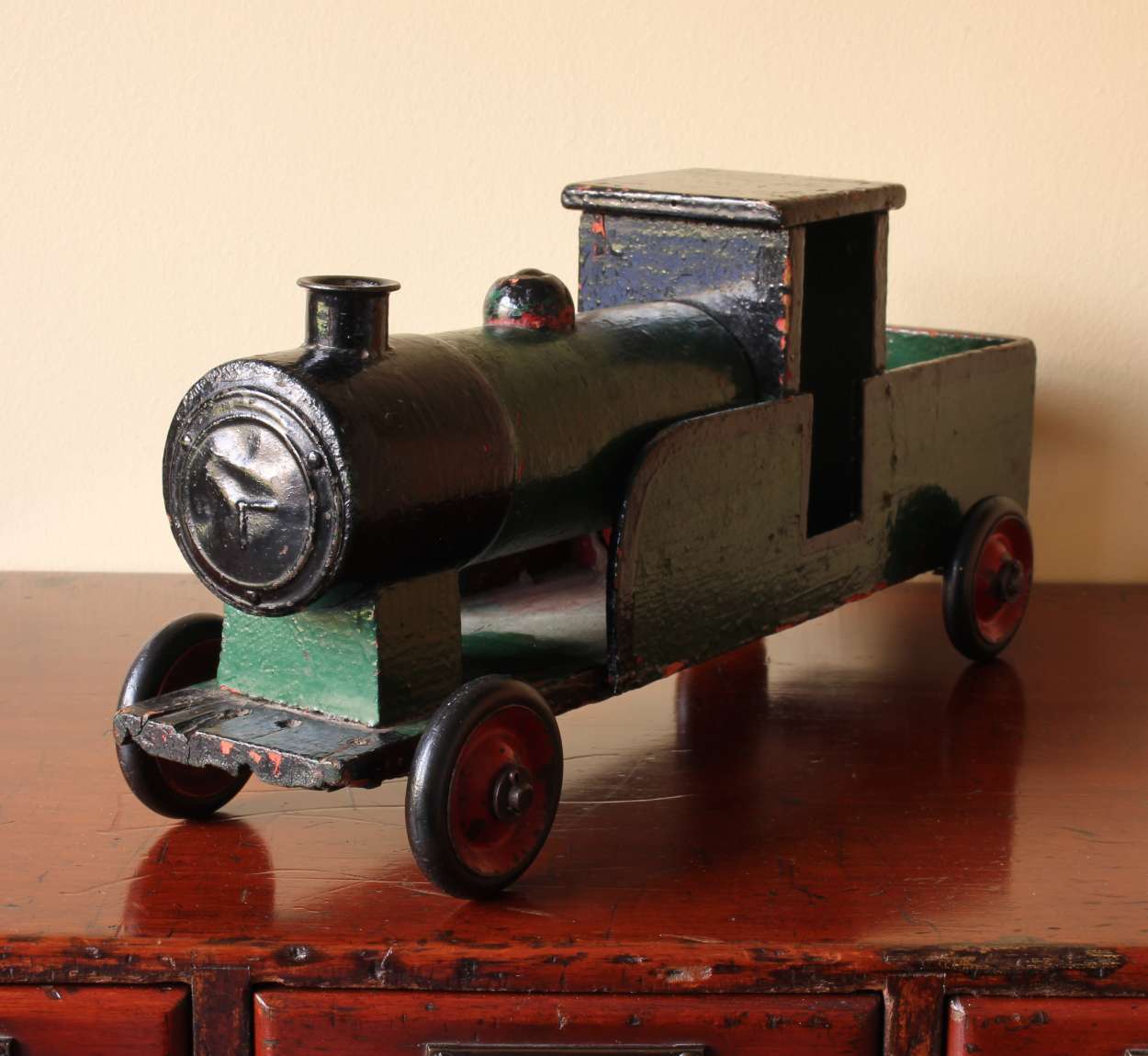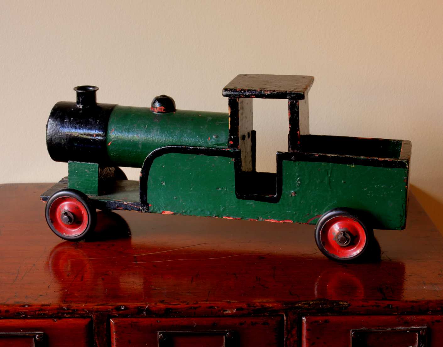 This handsome vintage model of a steam train which is made of wood is painted in green and black and has a wonderful look.