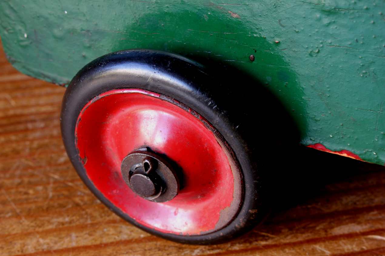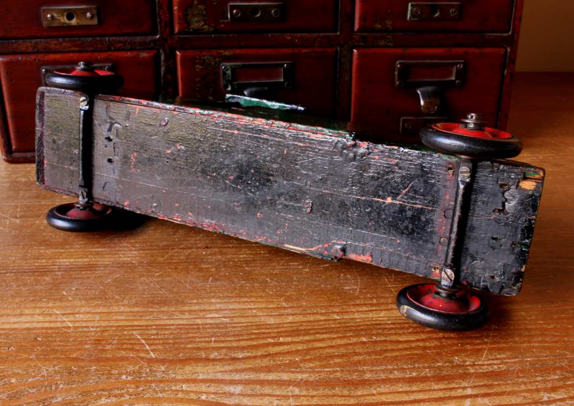 The model which looks to date from the early 20th century is 13 1/2" in length and has 4 metal painted red wheels with rubber tyres.