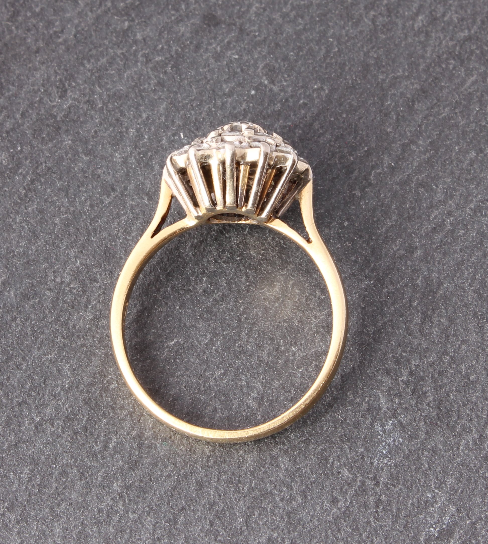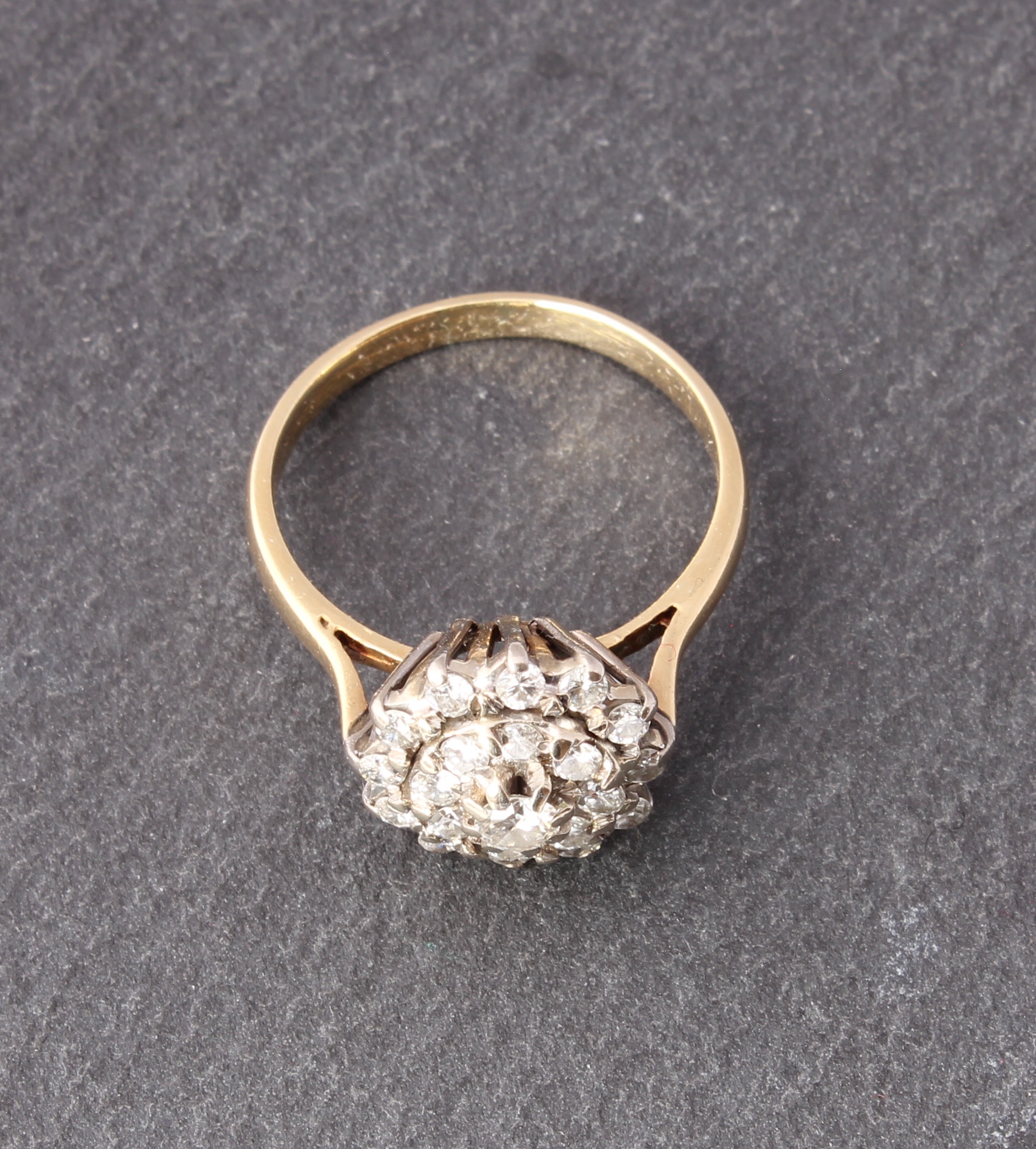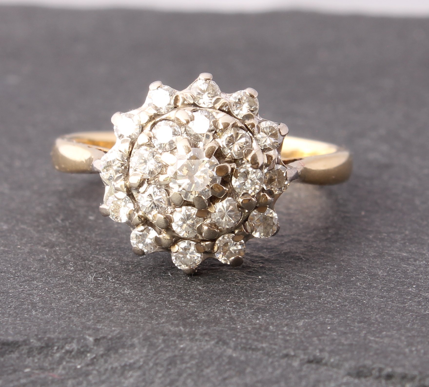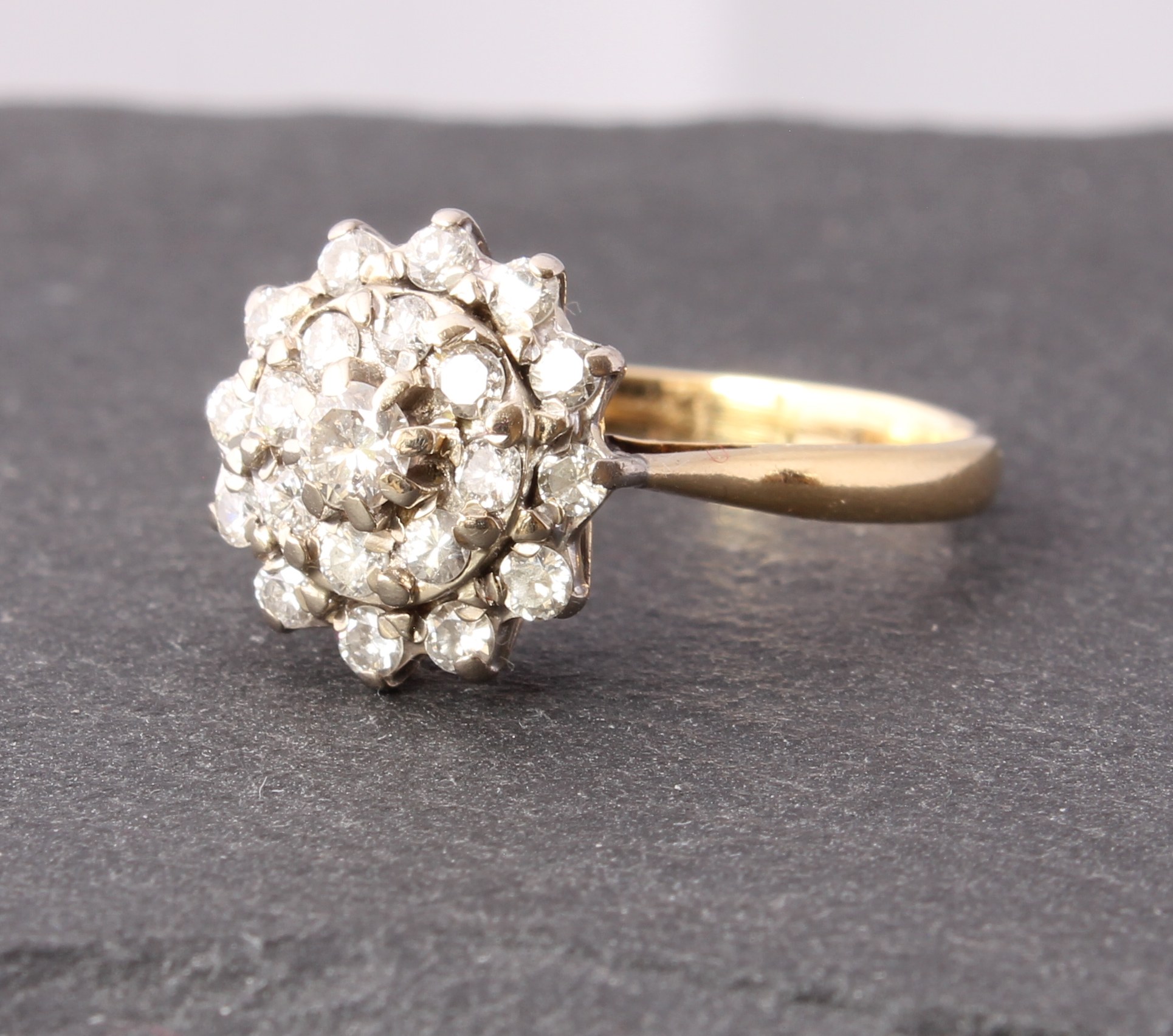 This wonderful vintage diamond cluster ring is crafted in 18ct yellow gold with 0.75 carat of brilliant-cut natural diamonds set in a tiered cluster. There are 21 natural diamonds in total which are well matched, bright and sparkly.