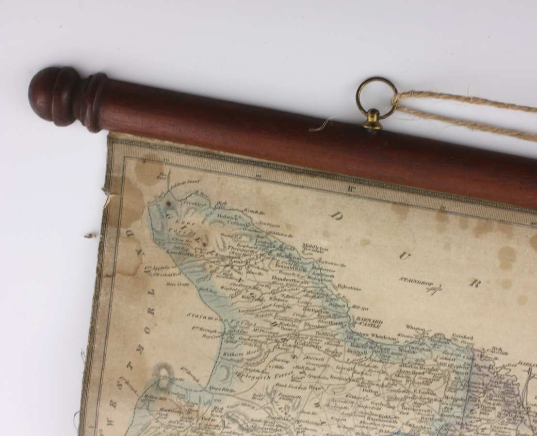 This fascinating map which is linen backed and mounted with mahogany scrolls to the top and bottom looks great hung on a wall. This map has a wonderful aged look with beautiful patination and is unusual being mounted with the wooden scrolls.